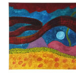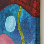 Centralnym elementem kompozycji jest czerwony wąż, który wydaje się być tajemniczym punktem skupienia w otaczającej go głębi. Intensywne barwy farb akrylowych podkreślają zarówno siłę wyrazu, jak i enigmatyczny charakter podwodnej scenerii.