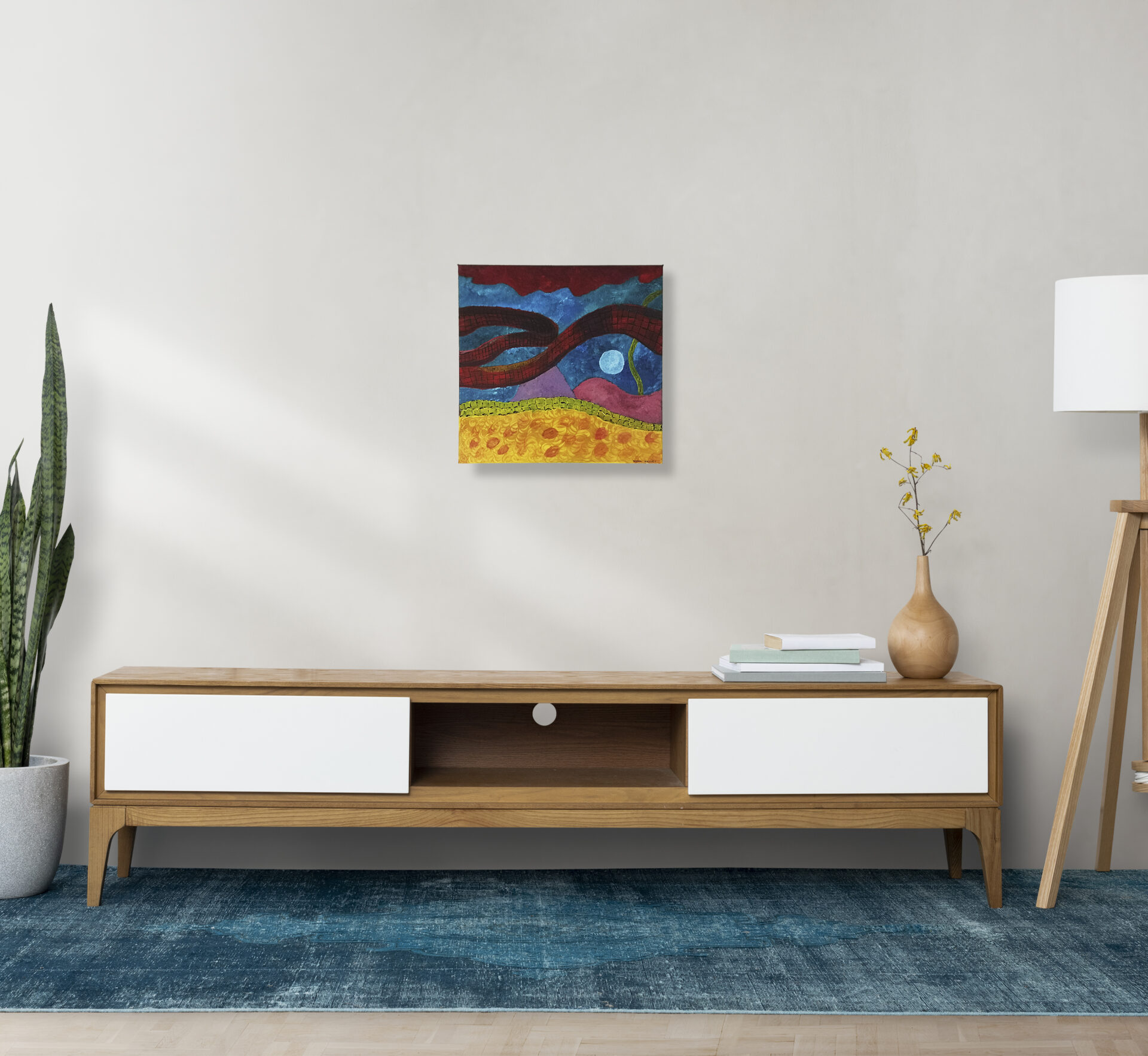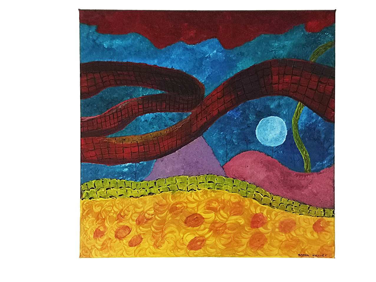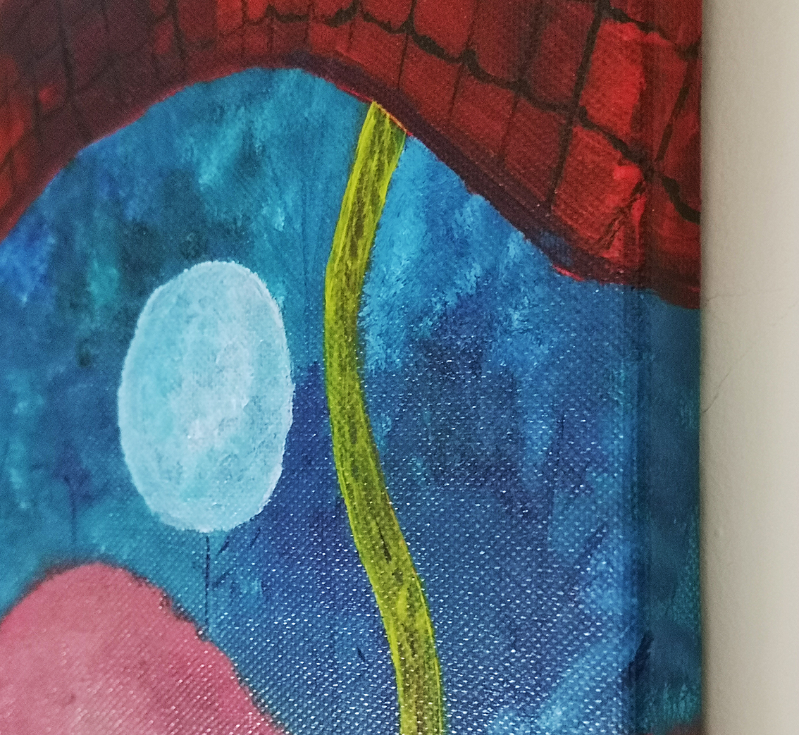 Centralnym elementem kompozycji jest czerwony wąż, który wydaje się być tajemniczym punktem skupienia w otaczającej go głębi. Intensywne barwy farb akrylowych podkreślają zarówno siłę wyrazu, jak i enigmatyczny charakter podwodnej scenerii.