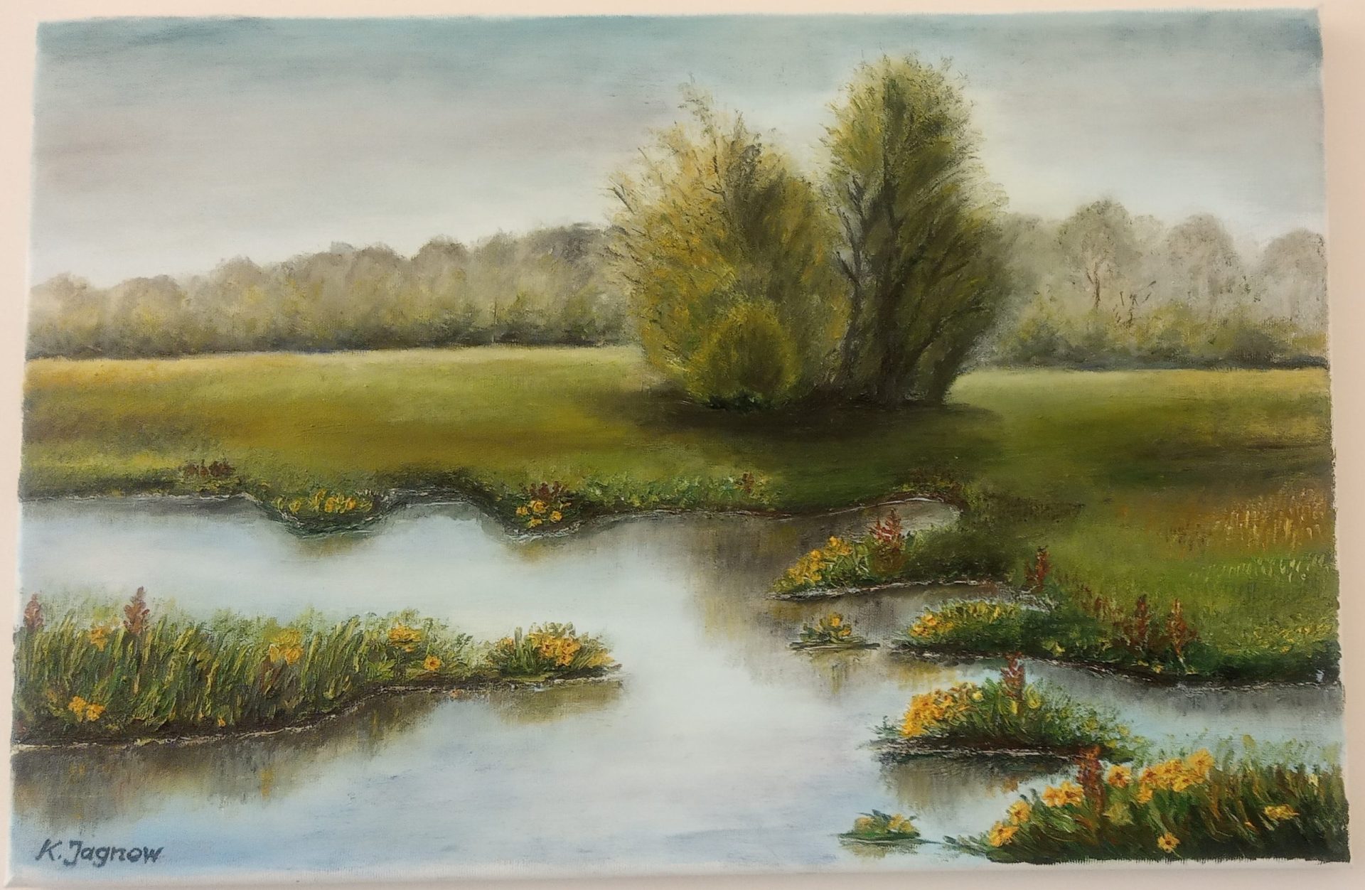 Obraz olejny, na płótnie lnianym o wymiarach 40x60cm, przedstawiający mokradła.