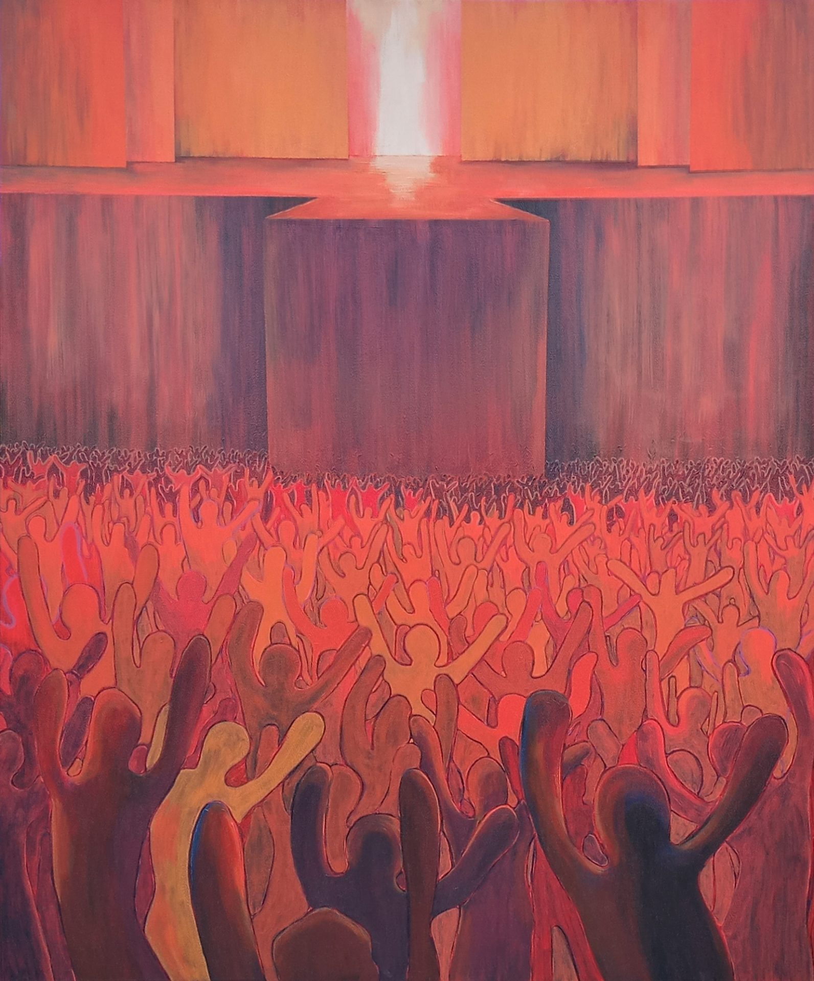Na obrazie przedstawiony jest kult jednostki i nadawanie boskich praw ludziom.