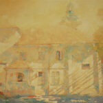 Postimpresjonistyczno-abstrakcyjny obraz przedstawiający klasztor księży Marianów w Stoczku Klasztornym w środku upalnego lata.