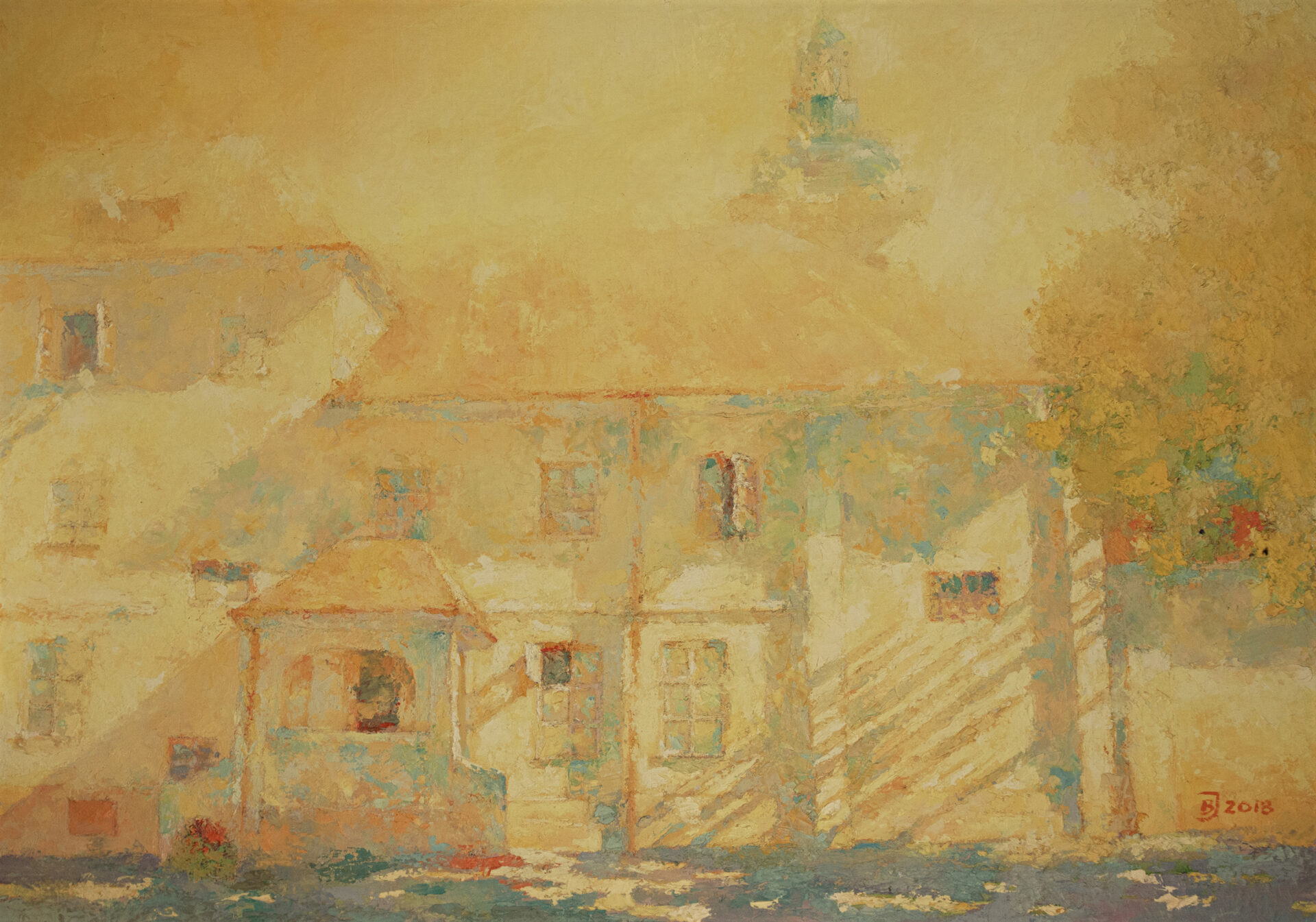 Postimpresjonistyczno-abstrakcyjny obraz przedstawiający klasztor księży Marianów w Stoczku Klasztornym w środku upalnego lata.