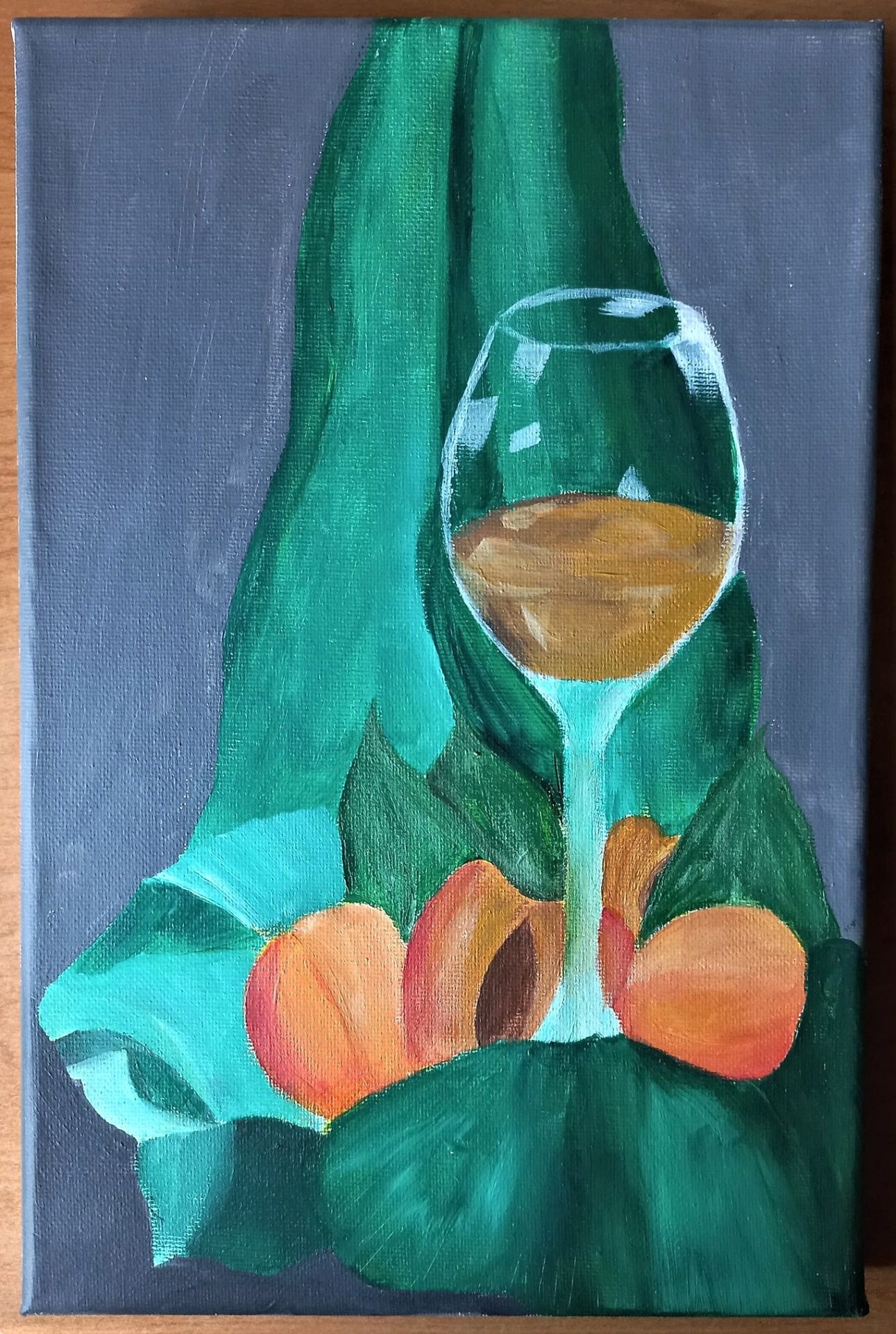 Tajemnicze połączenie wina i moreli, sprawdzi się jako ciekawa ozdoba Twojego wnętrza. Obraz wykonany na podobraziu, farbami akrylowymi.
