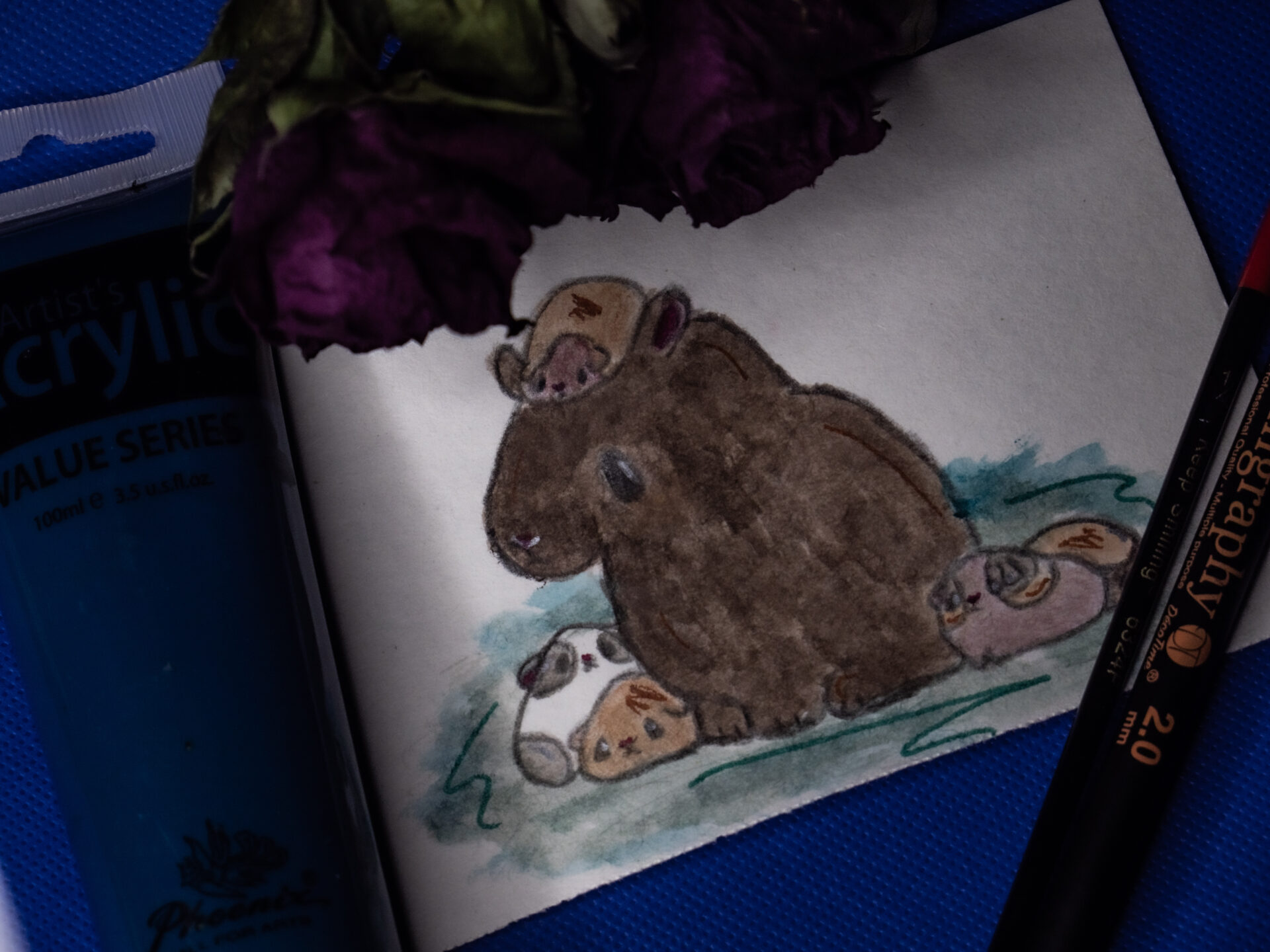 Malunek świnek morskich, wymysł własny. Namalowane farbami akrylowymi. Czas powstawania ok. 3 dni