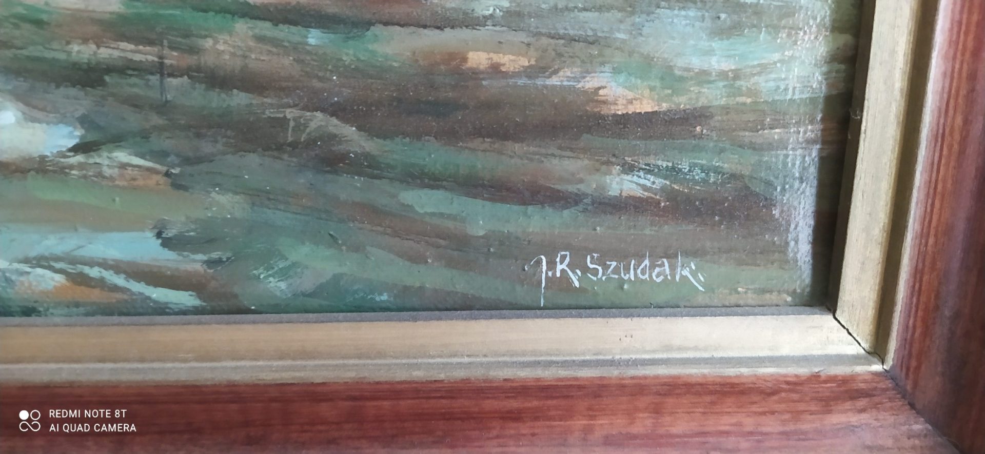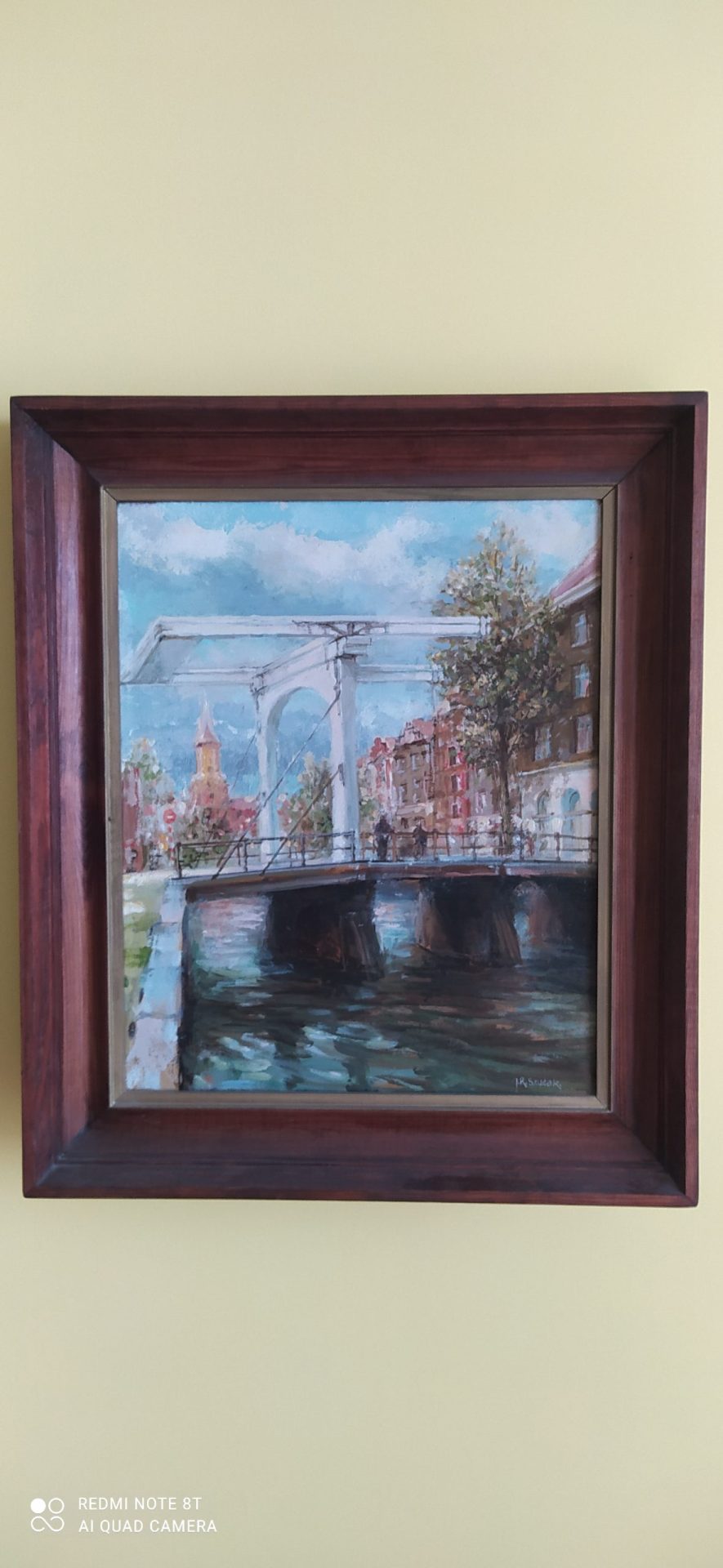 Obraz znanego śląskiego malarza Jacka Szudaka „Most w Amsterdamie” z roku 1992. Wymiary obrazu 41×33 cm.