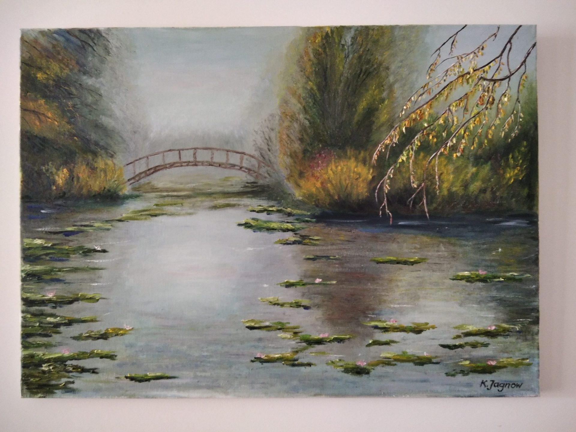 Obraz olejny, na płótnie o wymiarach 50x70cm, przedstawiający mostek nad stawem.