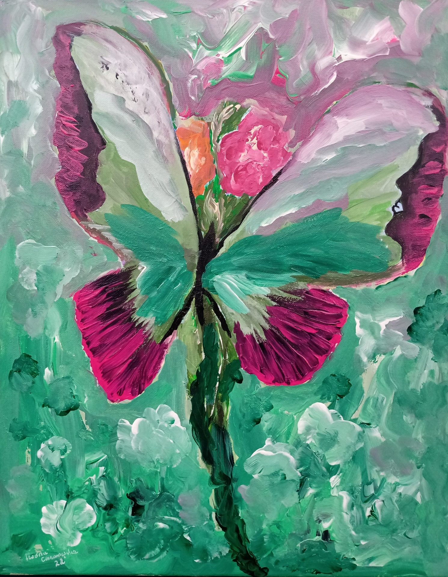 Obraz malowany farbami akrylowymi. Fantazja – motyl, kwiaty, ona, on – w sympatycznej symbiozie.