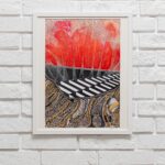 Tło obrazu płonie intensywnymi odcieniami czerwieni i pomarańczy, przypominając płomienie lub eksplozje dźwięków, które wybuchają w przestrzeni. Te barwy oddają pasję i intensywność emocji, jakie muzyka może wywoływać w słuchaczu. Są jak wulkaniczne erupcje, pełne energii i życia, które nieustannie się zmieniają i ewoluują.