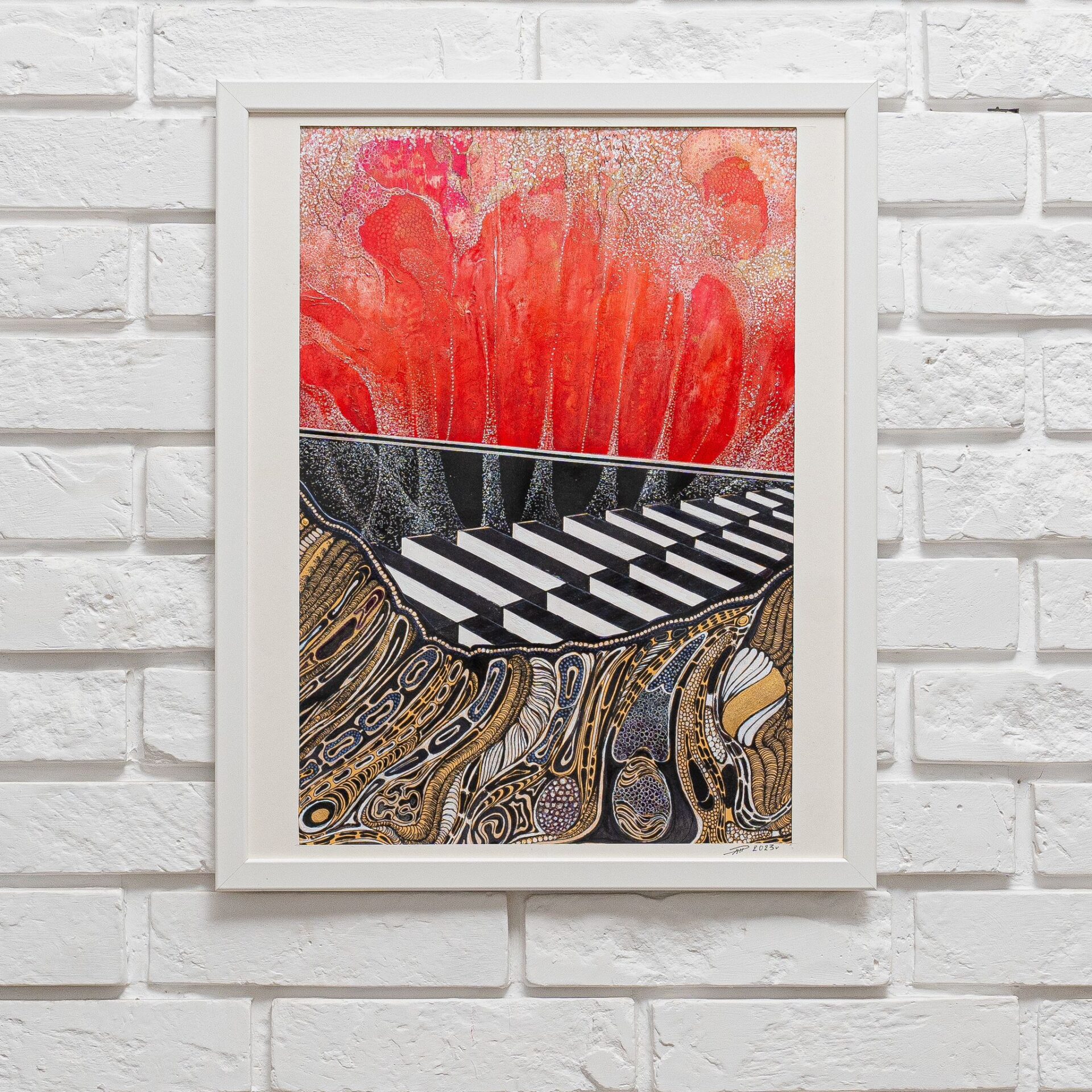Centralnym elementem obrazu jest klawiatura fortepianu, która rozciąga się przez środek płótna, niczym most łączący dwa odmienne światy. Czarno-białe klawisze, wyraziste i kontrastujące, prowadzą nas ku tajemniczemu horyzontowi, gdzie zaczyna się magia muzyki. To metafora nieskończonych możliwości i ścieżek, które muzyka otwiera przed nami.