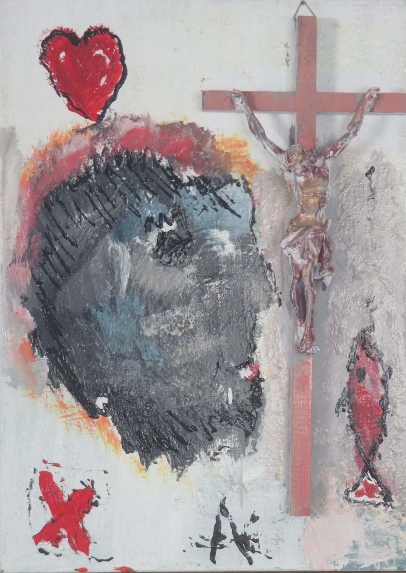 Obraz na płótnie z wkomponowaną postacią ukrzyżowanego Chrystusa. Zawiera wszystkie symbole artysty: serce – miłość, ryba – wolność i „X” – szczęście. Więcej o artyście na stronie: https://akm-kreutzberg.eu/