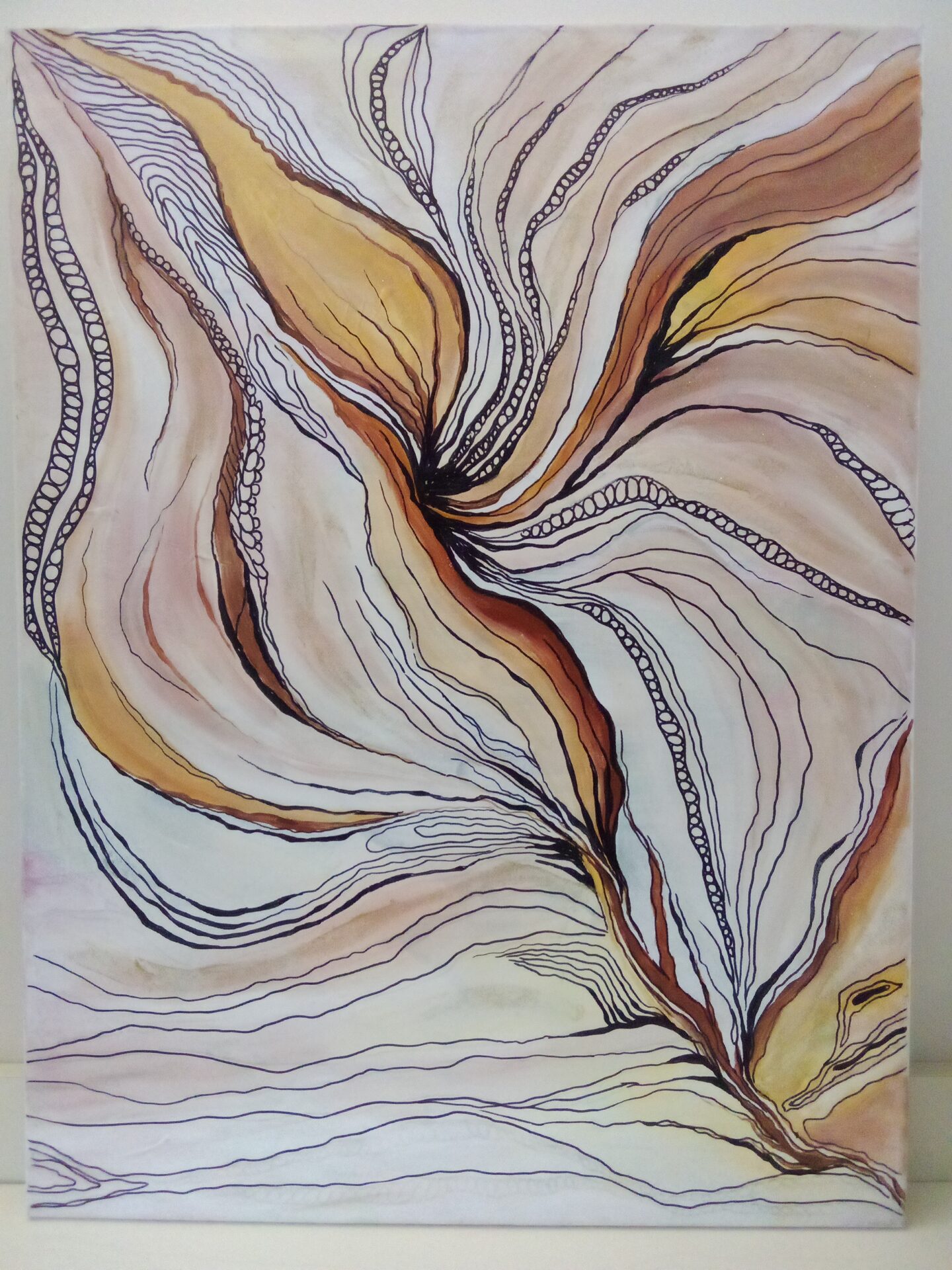 Obraz olejny na płótnie. Wymiary 60 x 80 cm. Abstrakcja utrzymana w kolorach brązu, żółci, beżu, czerni. Doskonała do nowoczesnego wnętrza.