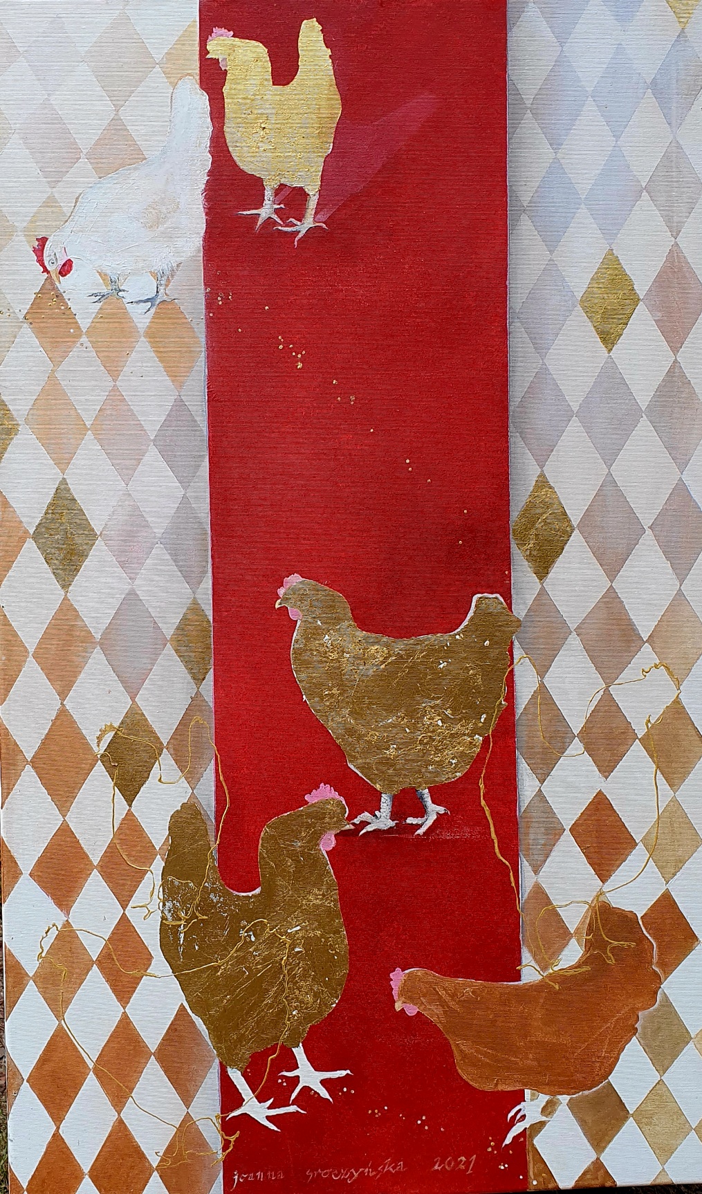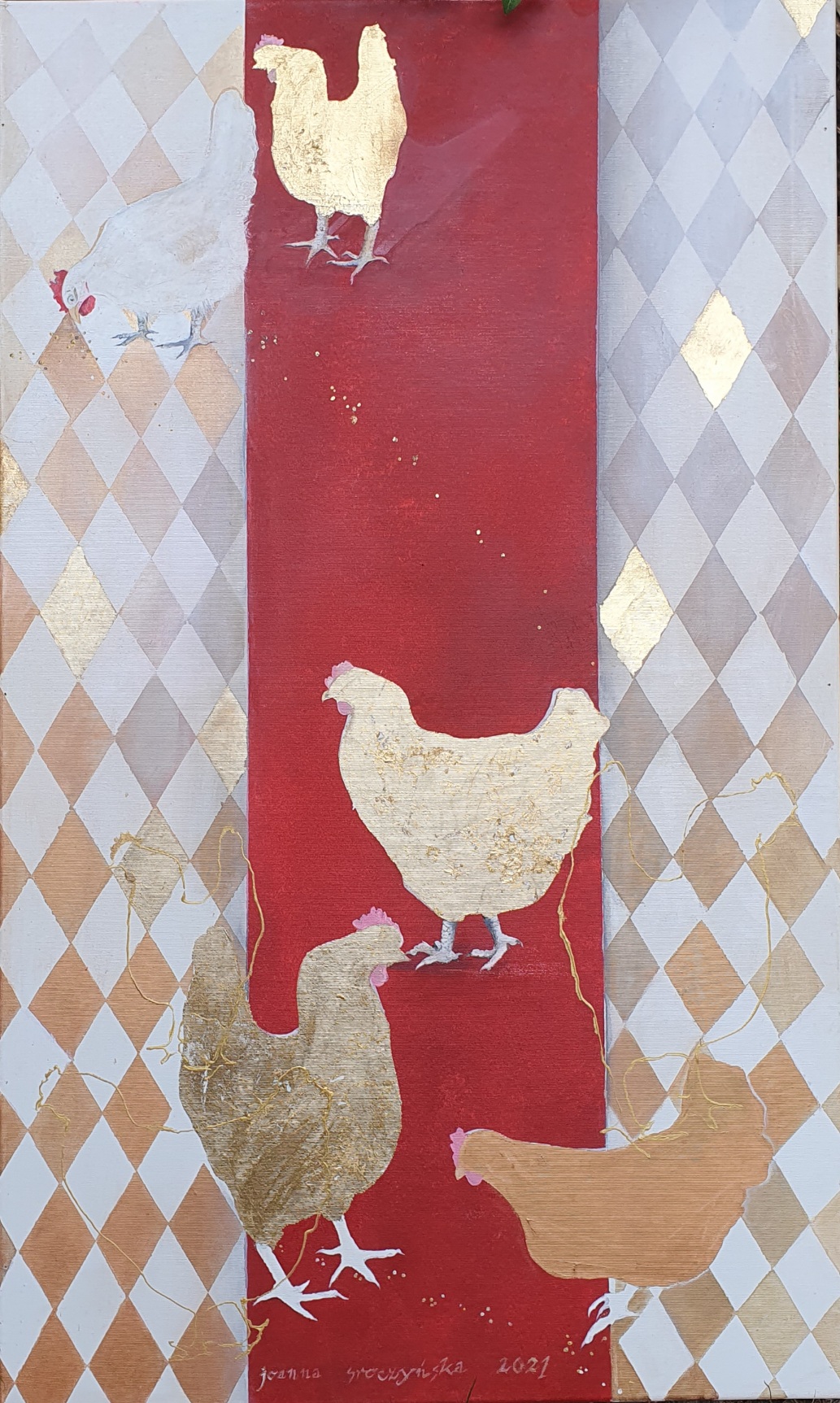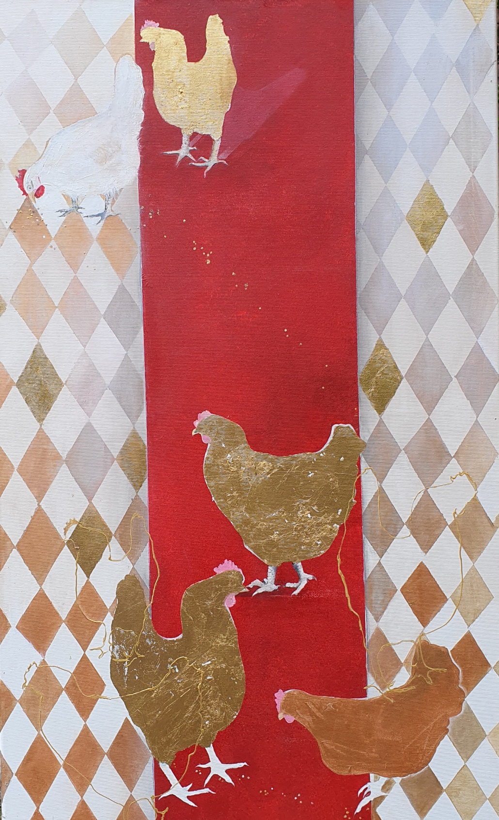 Akryl na płótnie, złotko. I oto kury lansujące się na czerwonym dywanie 😉 😉 mocny detal do każdego wnętrza:)