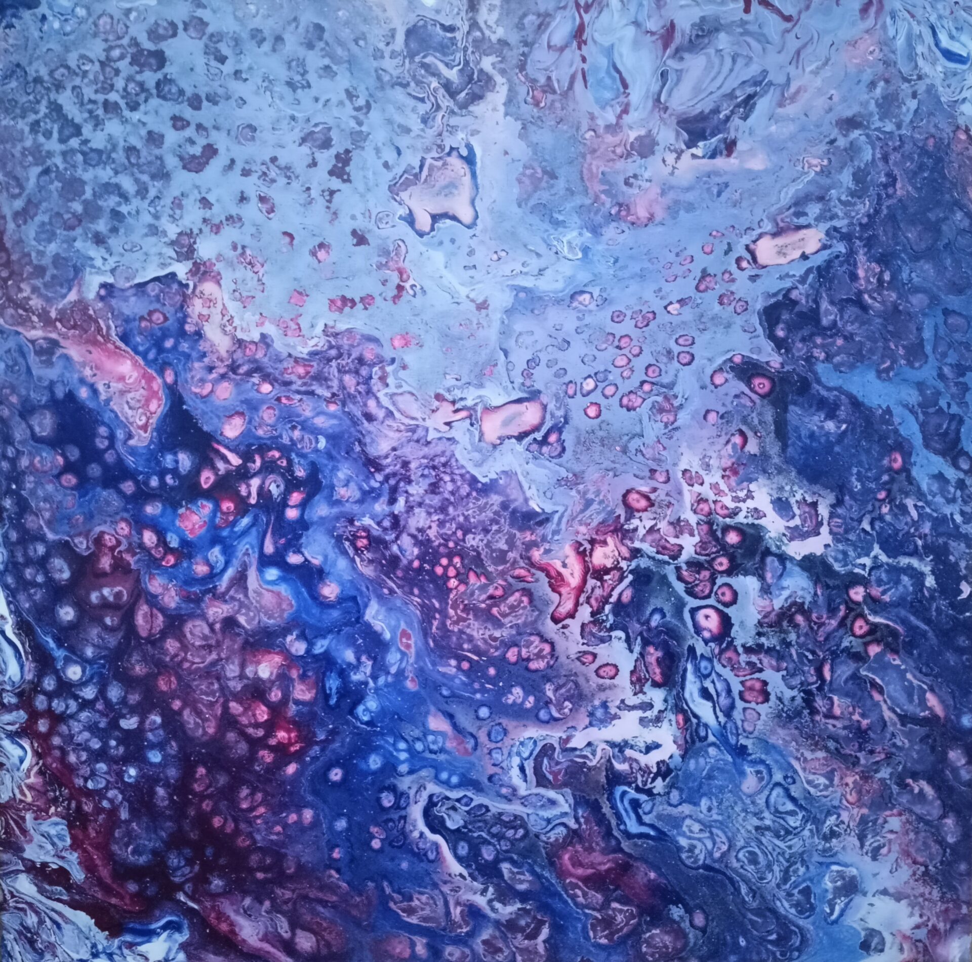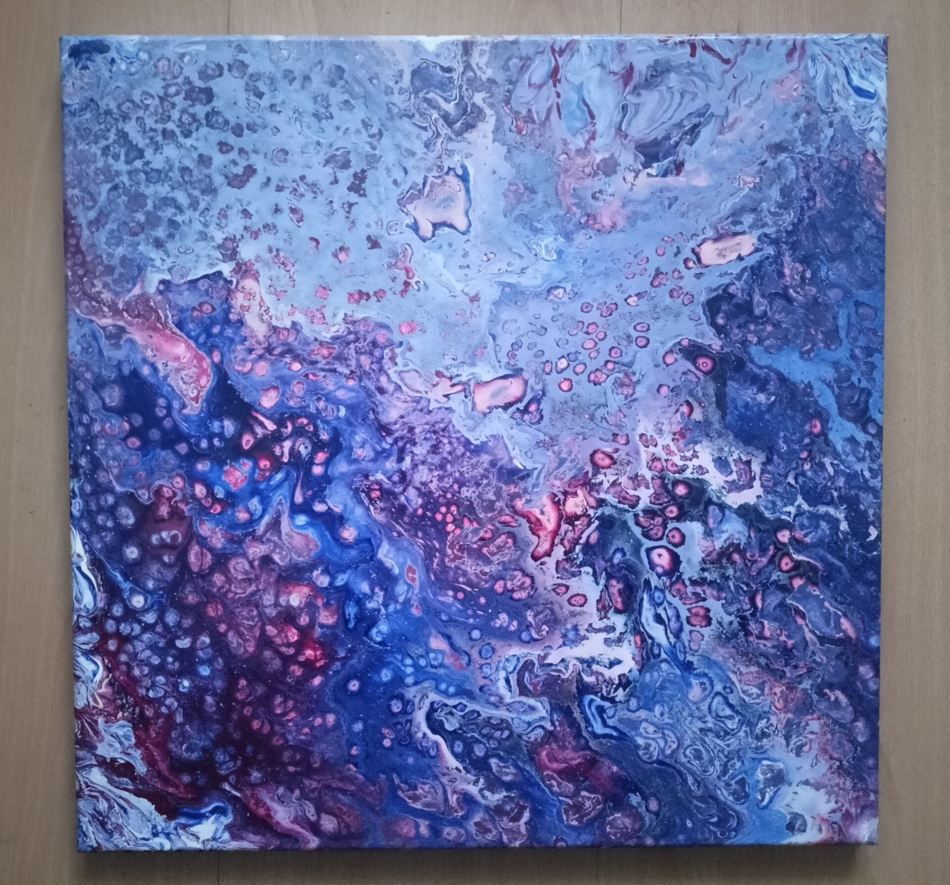 Obraz abstrakcyjny akrylowy na płótnie stworzony technika pouringu o rozmiarach 40×40, boki są kontynuacją obrazu