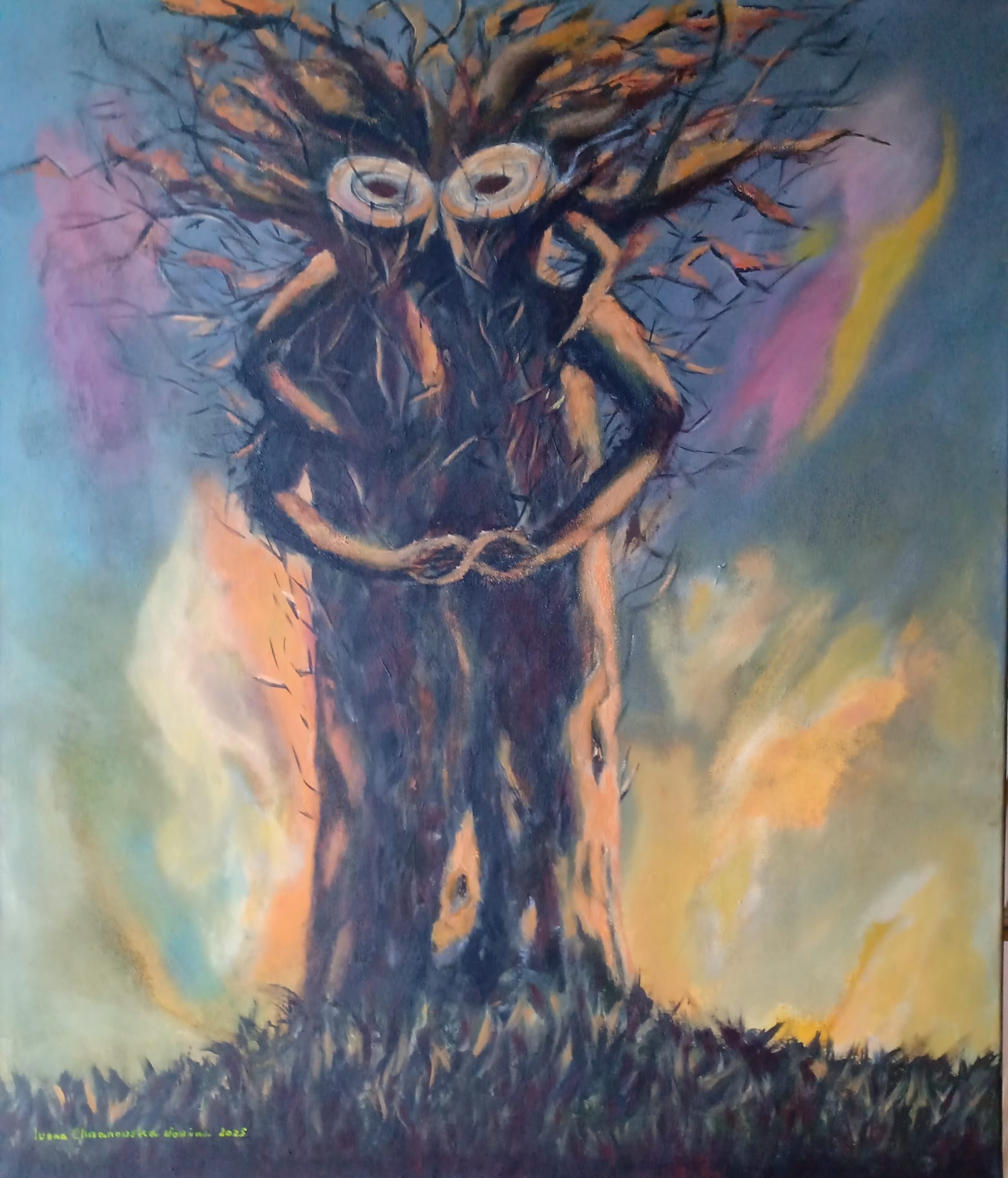 Drzewa splecione razem. Przycięte, a dalej odrastają. Symbolizują niewiarygodną moc, odrodzenie, wrażliwość. Boki są zamalowane w tonach tła, zamontowana zawieszka.
