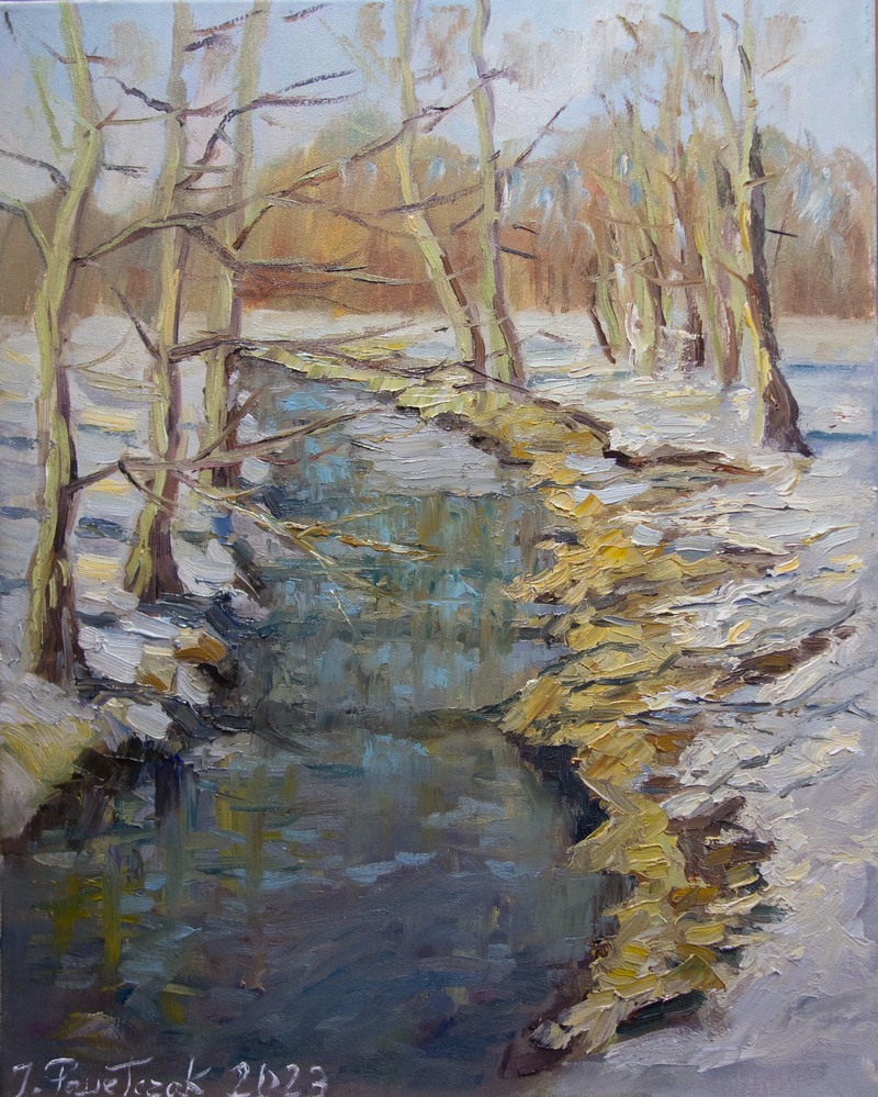 Obraz olejny na podobraziu płóciennym w technice alla prima z widoczną fakturą farby