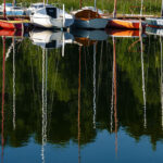 Odbicia zacumowanych jachtów tworzą na wodzie barwny, wibrujący obraz (Jezioro Wigry).