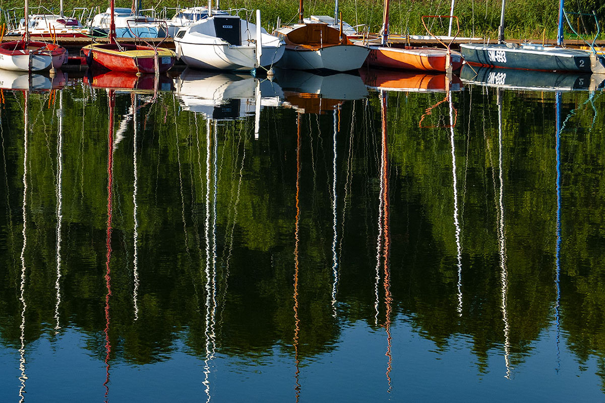 Odbicia zacumowanych jachtów tworzą na wodzie barwny, wibrujący obraz (Jezioro Wigry).