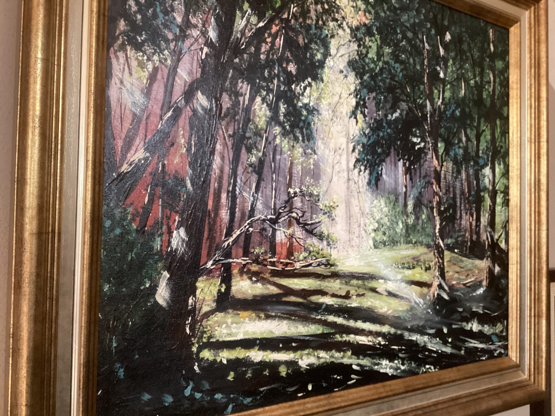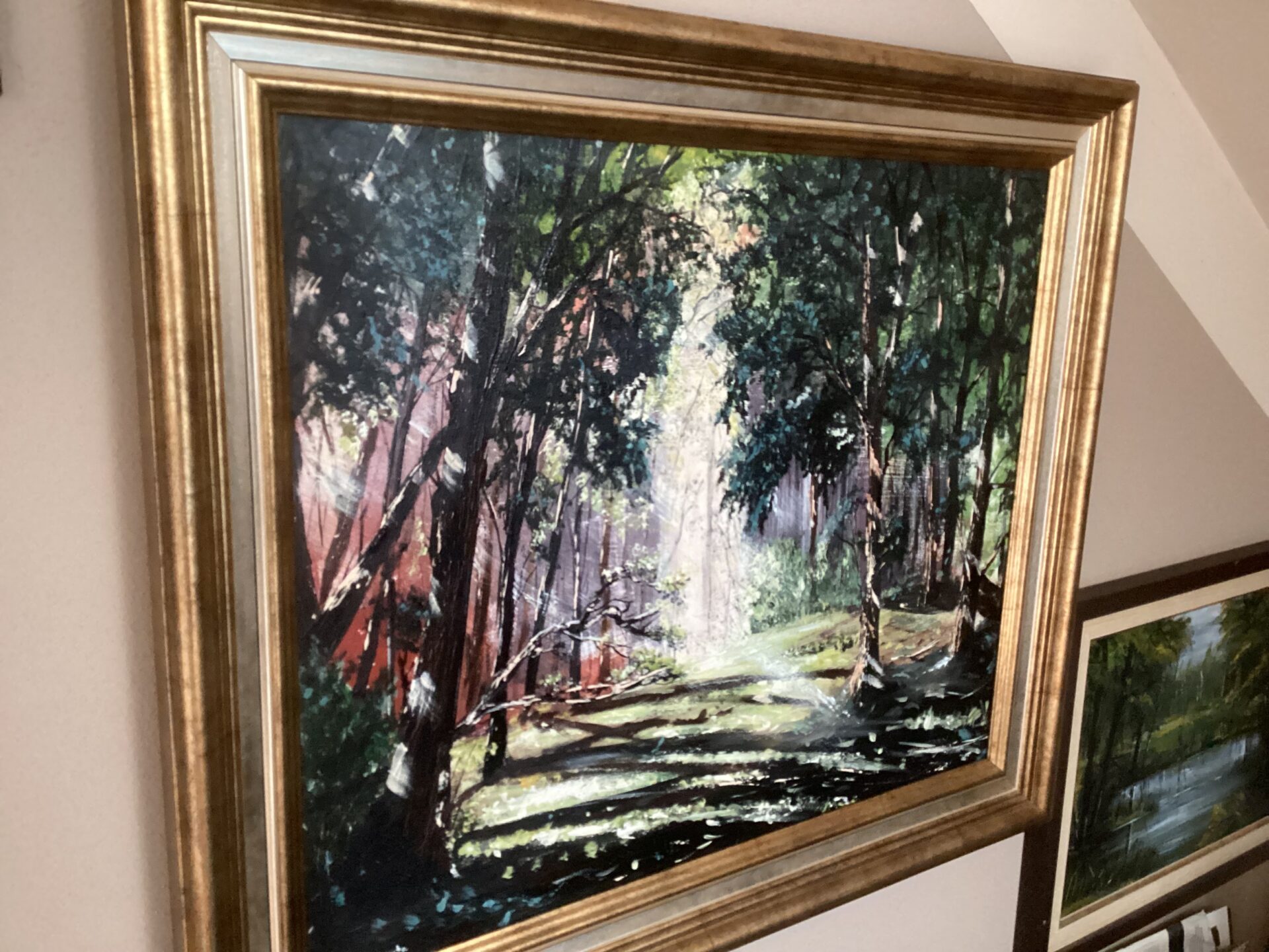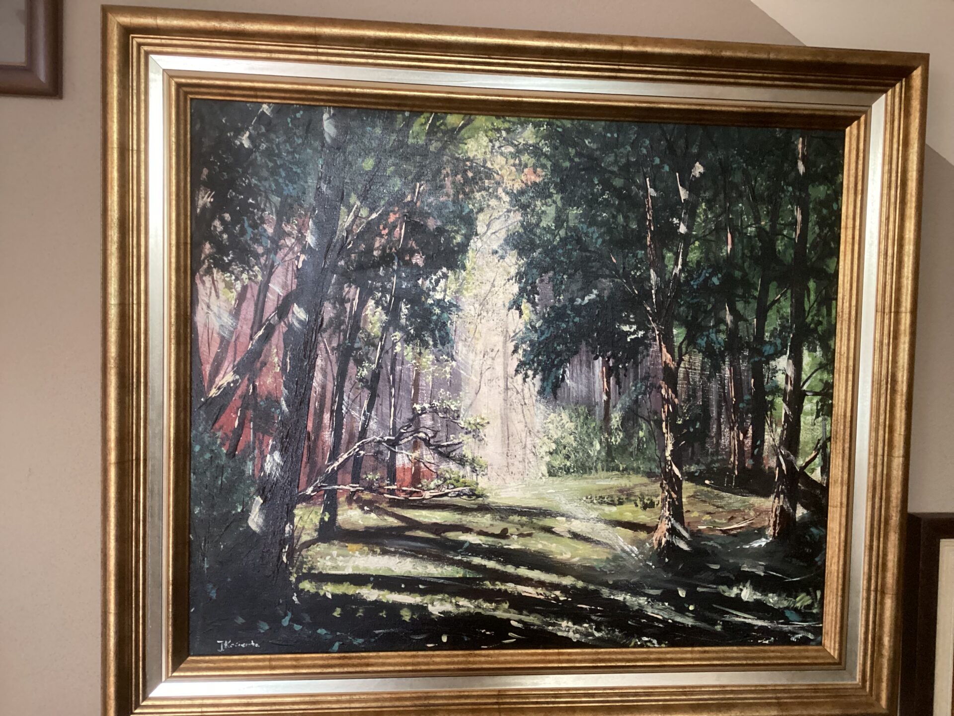 Rozświetlona promieniami słońca leśna polana, gdzie znużony wędrowiec może przystanąć , by nacieszyć się spokojem i majestatem tchnącym z Natury. Temat tej pracy, która powstała w 2020 roku inspirowany był moimi wędrówkami. Wyraźne kontrasty ożywiają pracę , a dodatkowy efekt osiąga ,gdy oświetlają ją promienie naturalnego światła. Płótno zawerniksowane. Obecnie -oprawiona w gustowną, podwójną ramę -jest ozdobą mego salonu. To koszt ramy determinuje też cenę podaną w ogłoszeniu. Z uwagi na rozmiar pracy wysyłka jedynie kurierem, możliwy jest także odbiór osobisty. Cena wysyłki jest wliczona, co oznacza, że podczas wizytu w mej pracowni mozliwe jest negocjowanie ceny. Zapraszam do kontaktu.