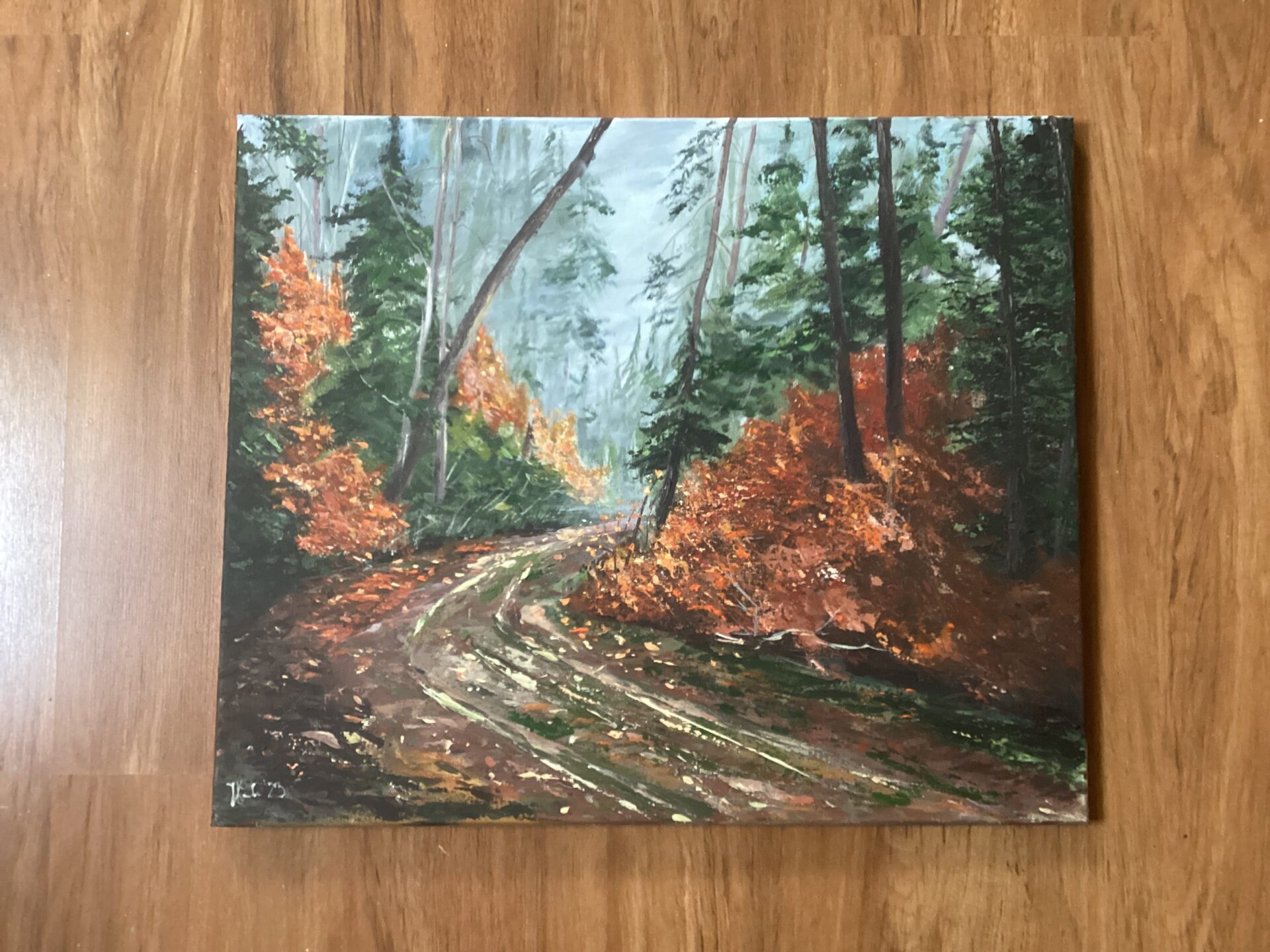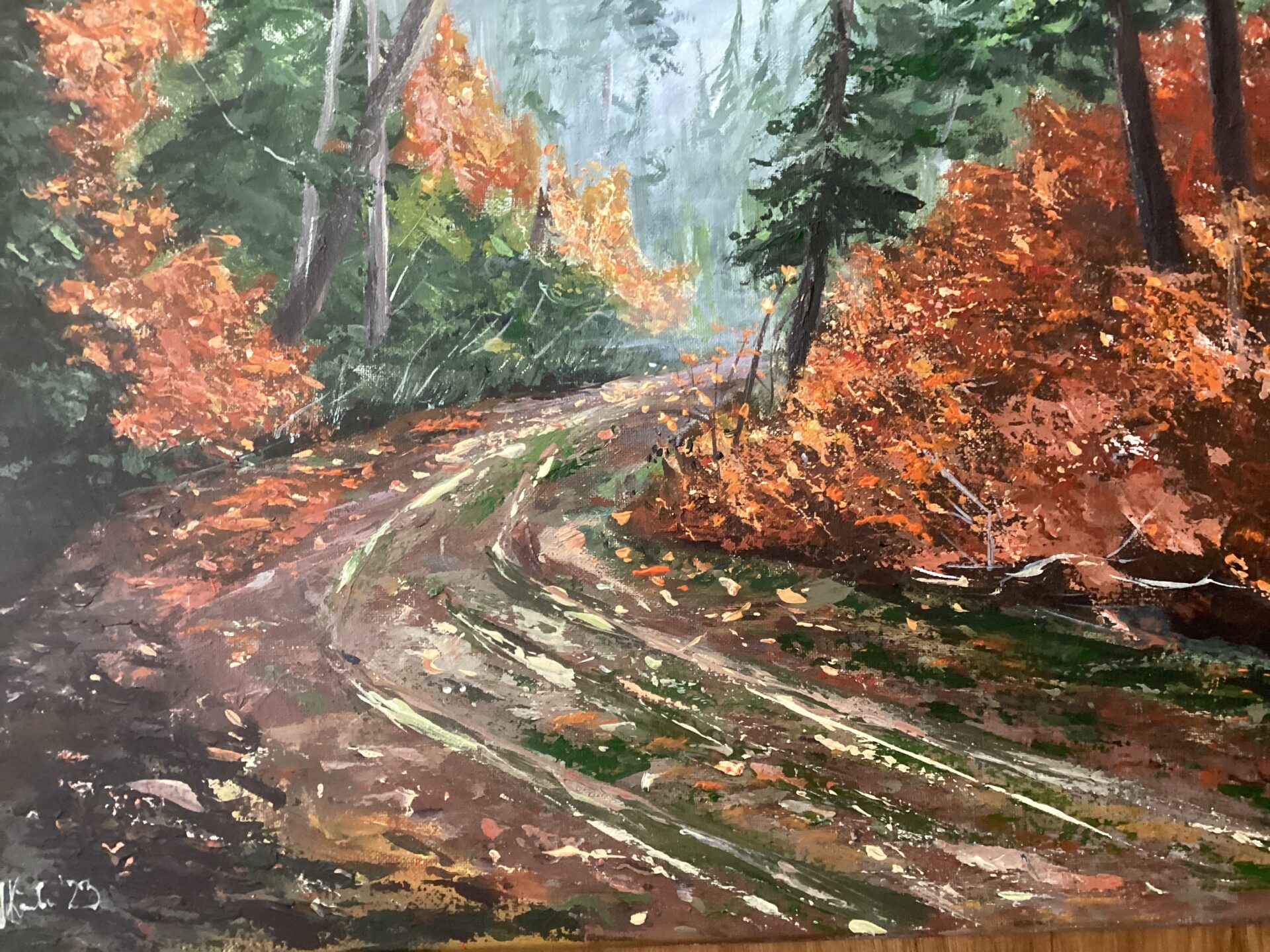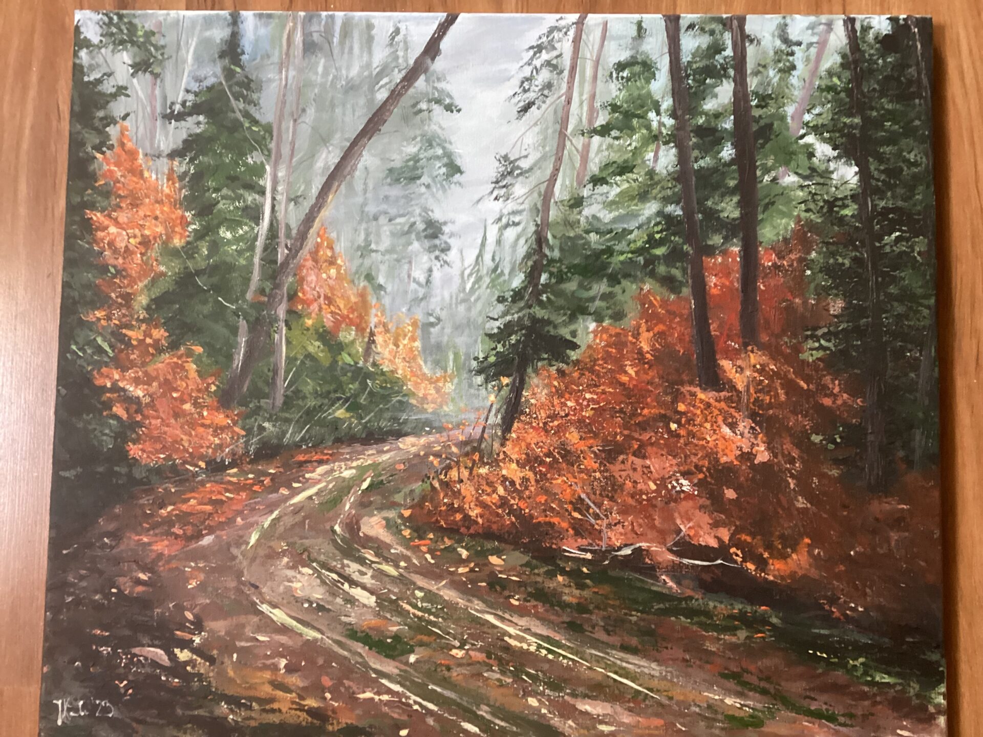 Wykonany szpachlą obraz przedstawia leśną drogę w mglisty,jesienny poranek. To motyw często poruszany przeze mnie , fascynuje mnie bowiem przyroda, jej zmienność i kolory ,charakterystyczne dla kazdej pory roku. Taki piękne okolice są tuż obok miejsca, gdzie mieszkam. Jeśli zdecydujecie się Państwo na odbiór osobisty zakupionej pracy, zapraszam na wspólny spacer do tych pięknych miejsc.Obraz jest zabezpieczony satyniwym werniksem, bo nadaje farbom ochronę przez wyblaknięciem i spłowieniem.Maluję wysokiej jakości farbami akrylowami . Boki są kontynuacją obrazu, a z tyłu zamontowana jest zawieszka, co sprawia ,że obraz jest gotowy do powieszenia.