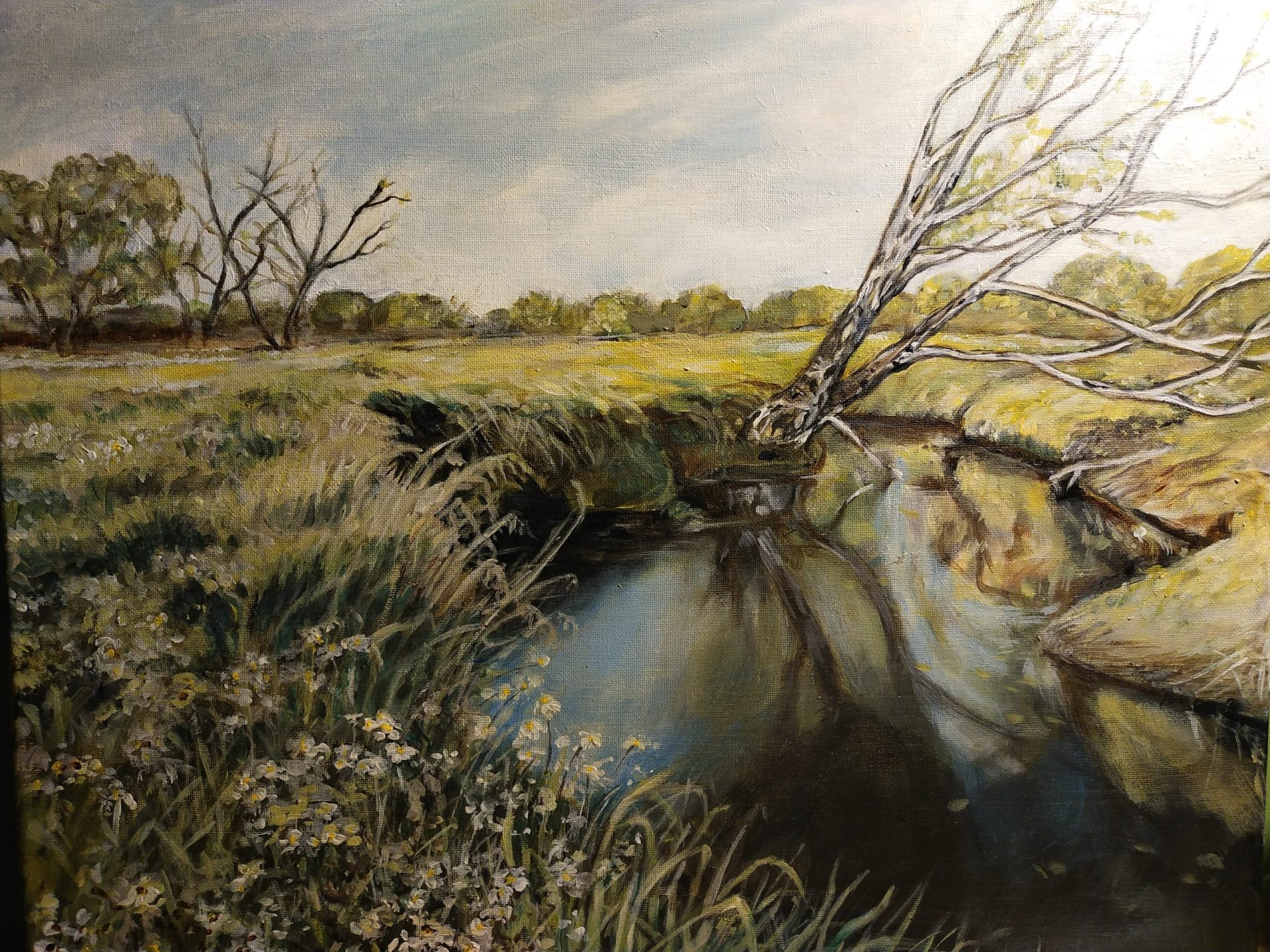 Pejzaż namalowany farbami akrylowymi na płótnie bawełnianym. Przedstawia ukwieconą polanę nad wodą.