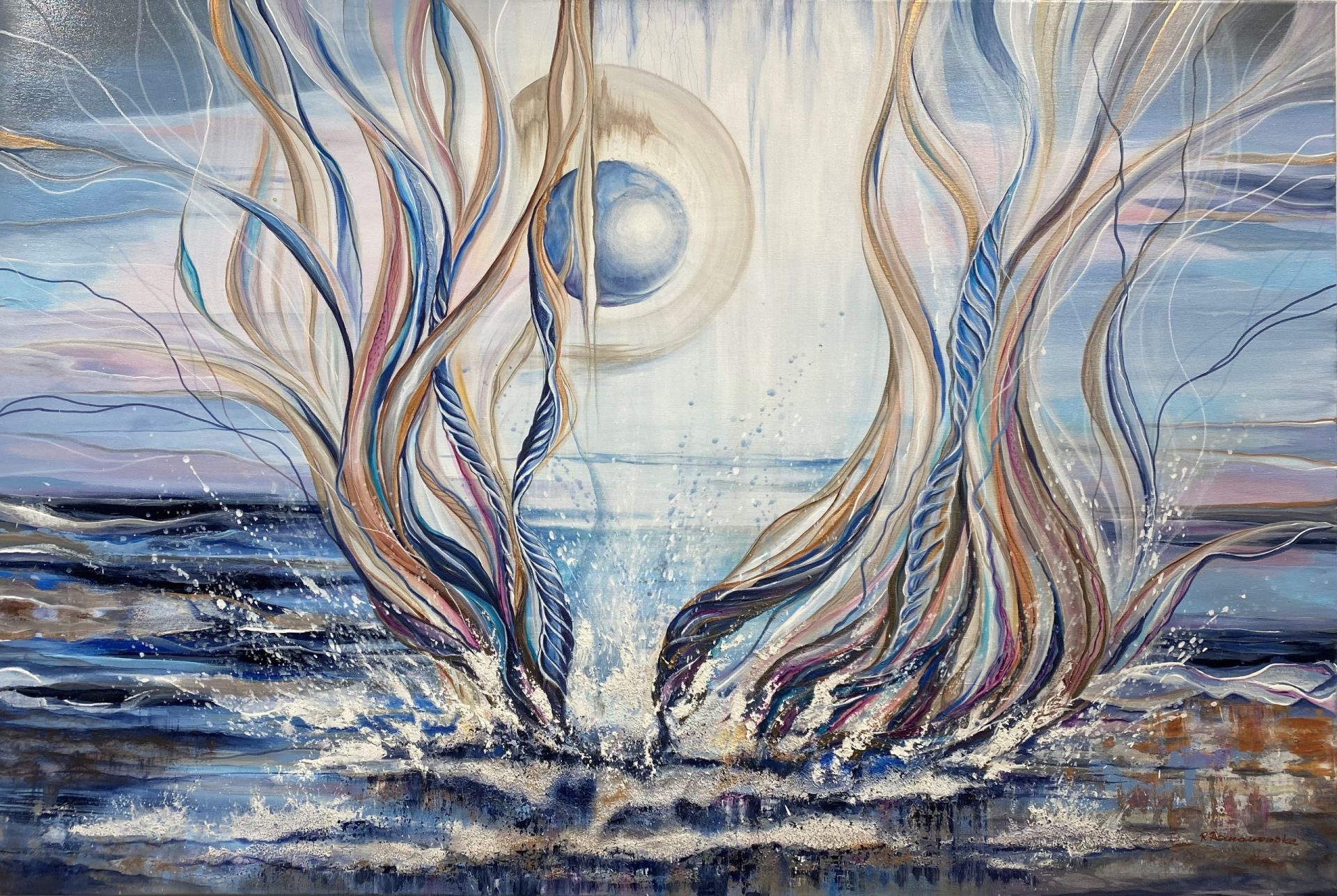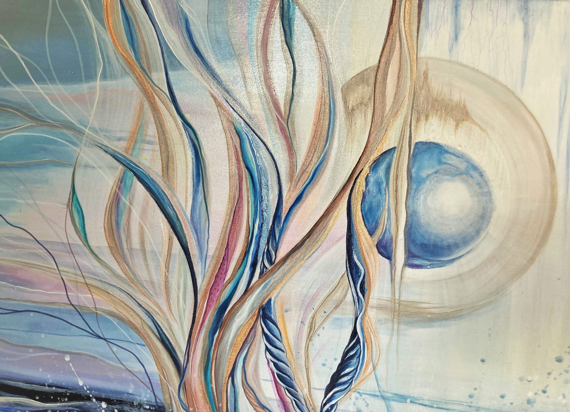 Obraz namalowany w technice akrylowej, werniksowany.Utrzymany w kolorystyce niebiesko-beżowej.
