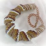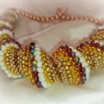 W skład spirali wchodzą koraliki fasetowane mieniące się w kolorach beżu i jasnego brązu oraz okrągłe drobne koraliki w kolorach ecru, złota i brązu.