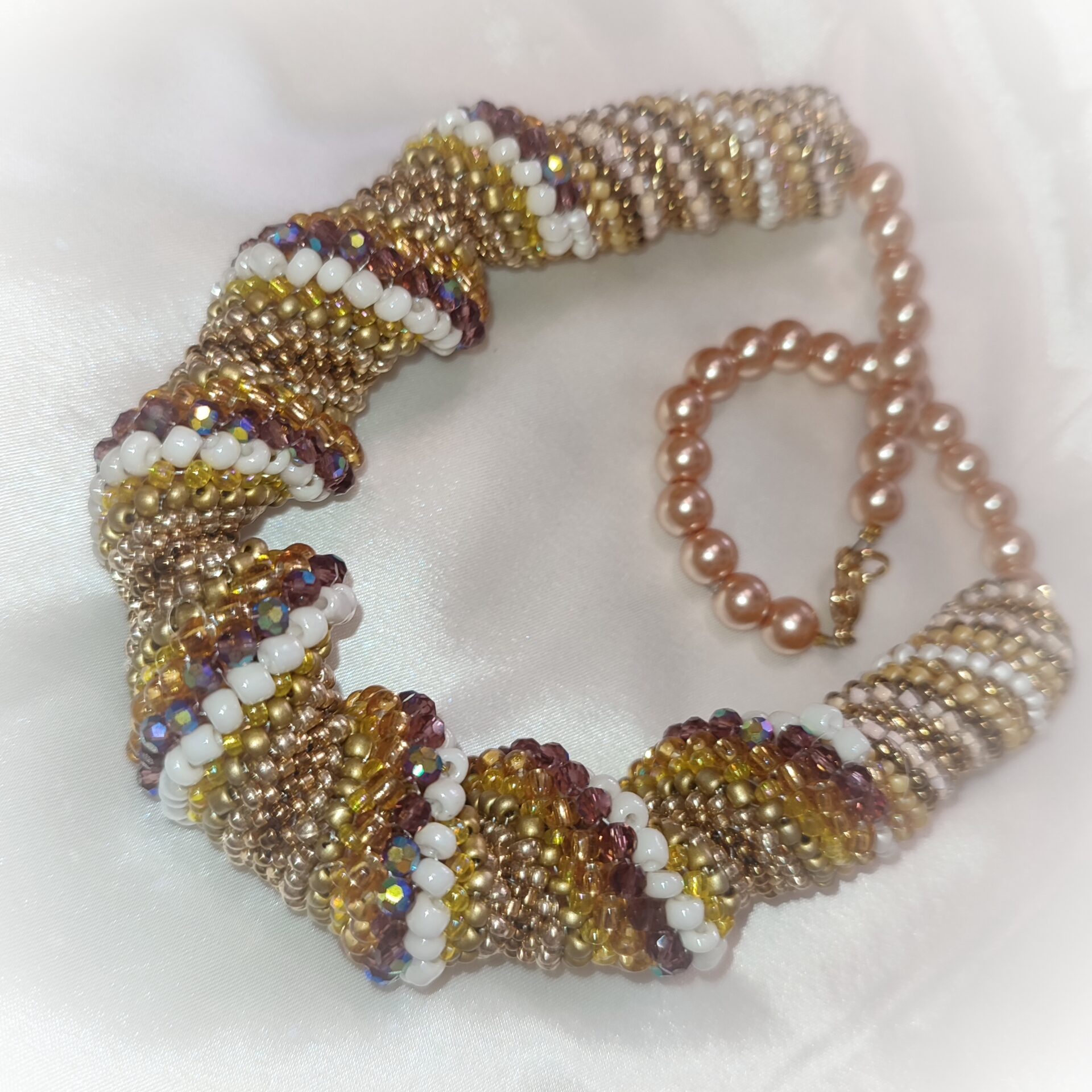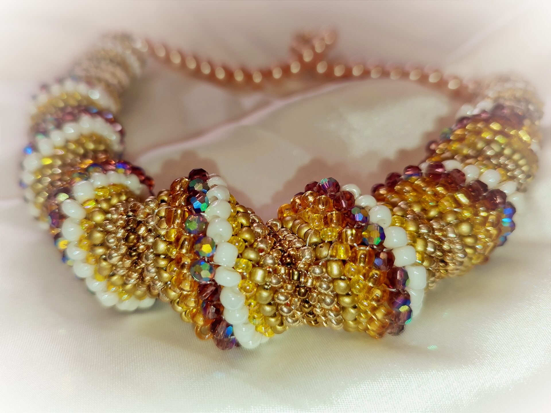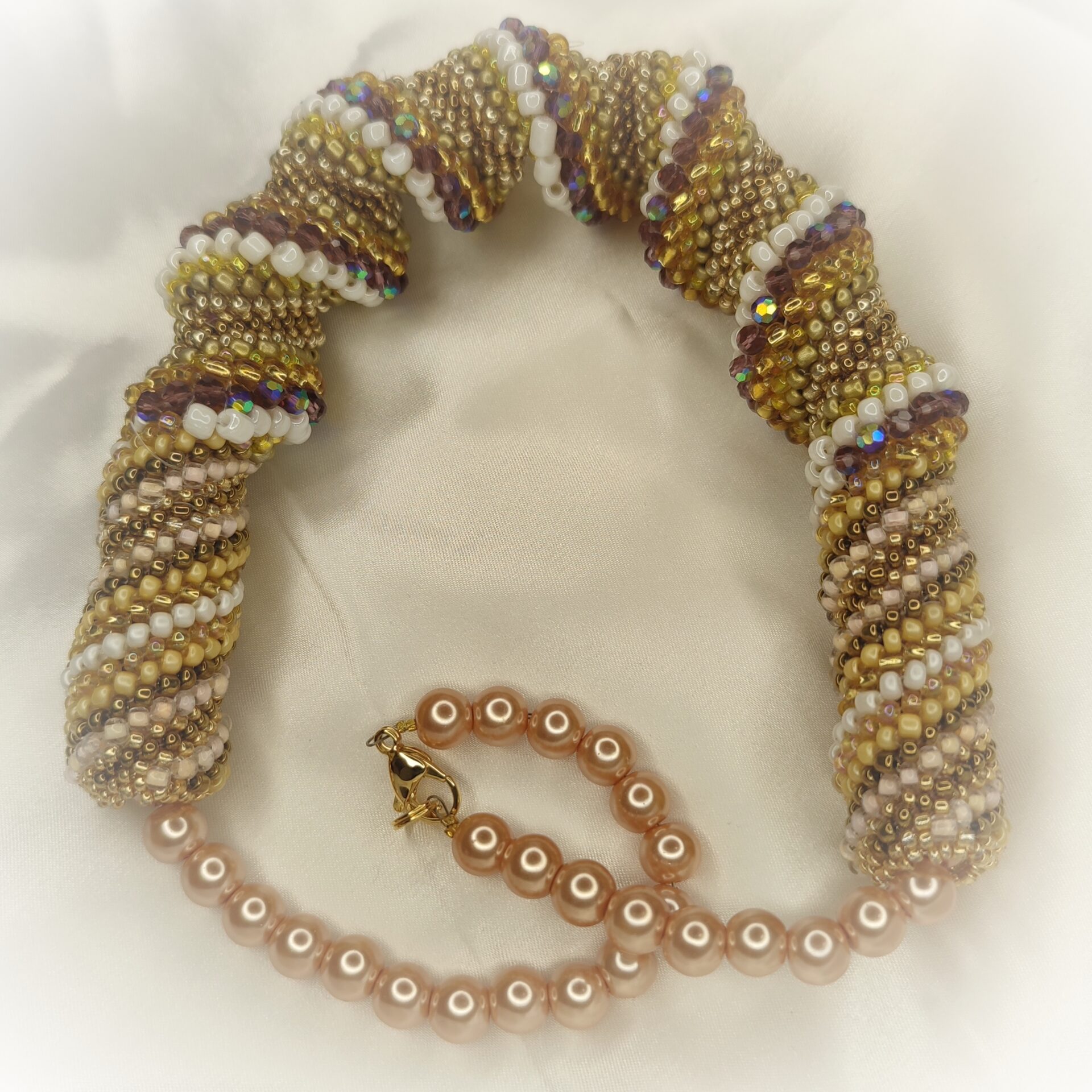 W skład spirali wchodzą koraliki fasetowane mieniące się w kolorach beżu i jasnego brązu oraz okrągłe drobne koraliki w kolorach ecru, złota i brązu.