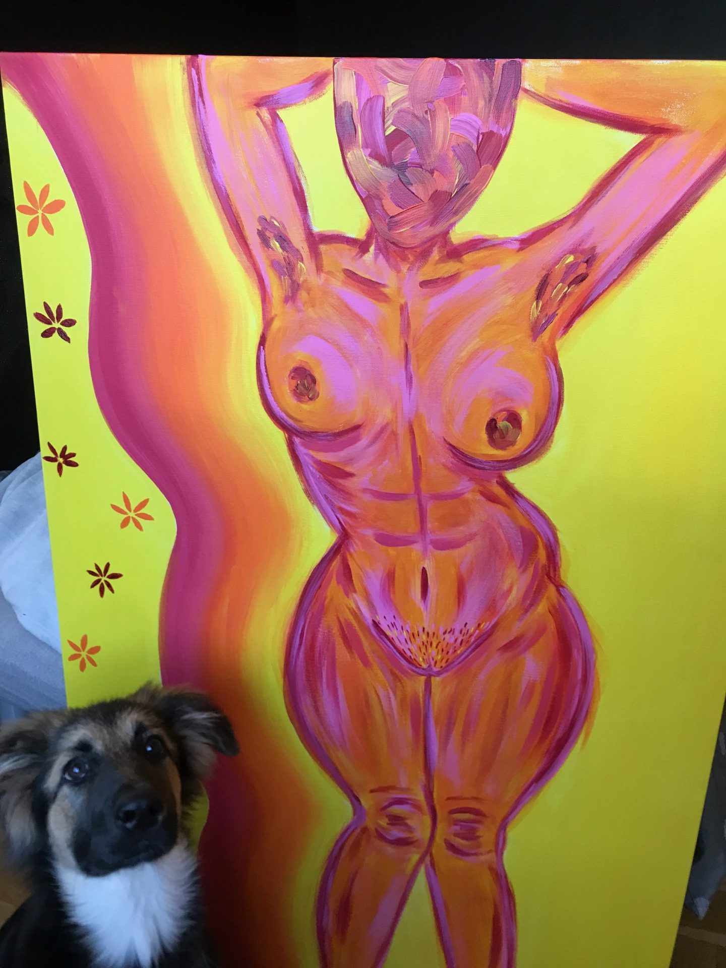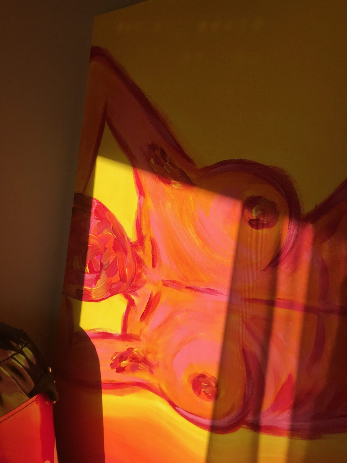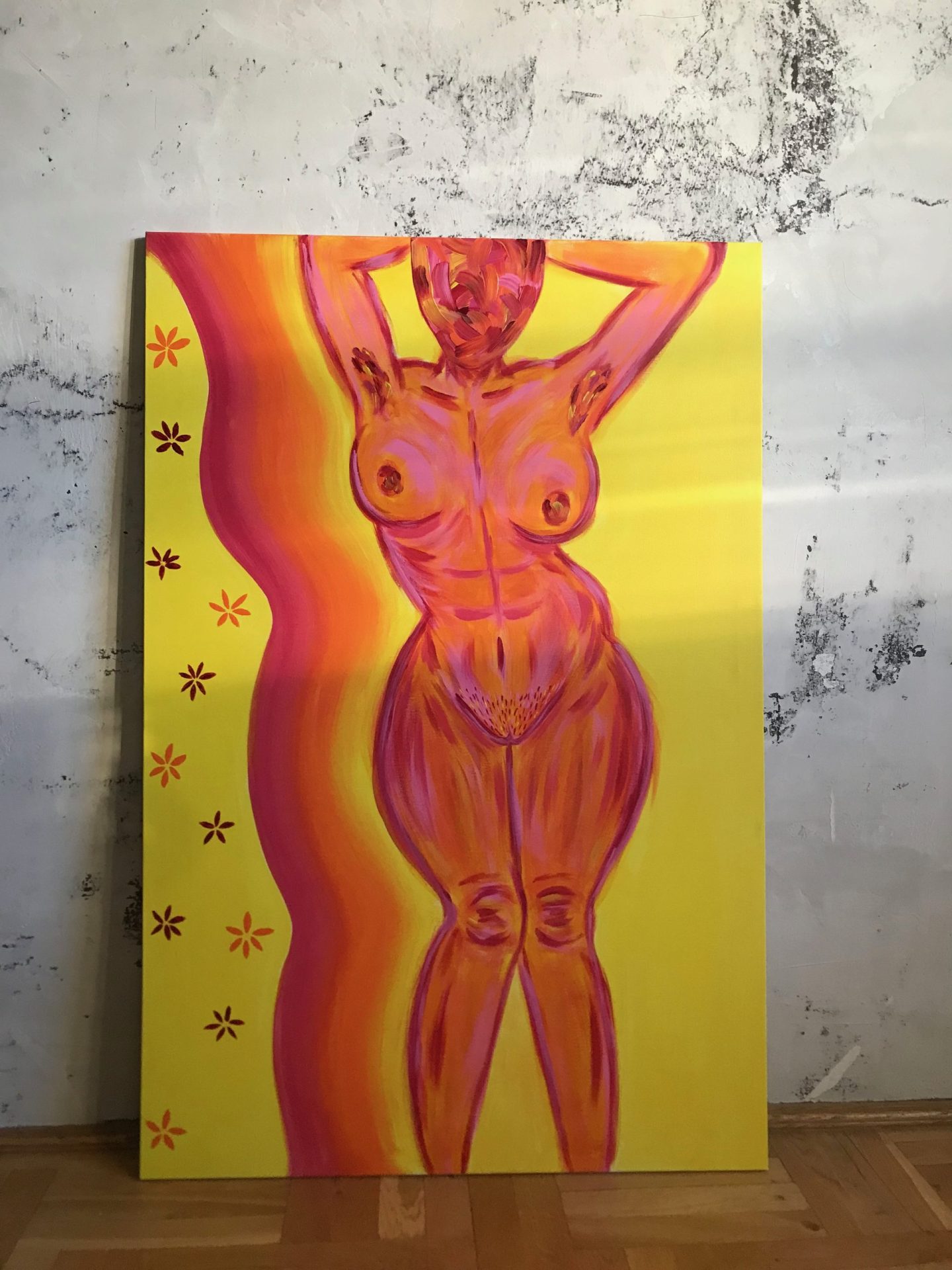 Obraz przedstawia ciało nagiej kobiety. Malowane farbami akrylowymi.Wymiary 120x80cm.