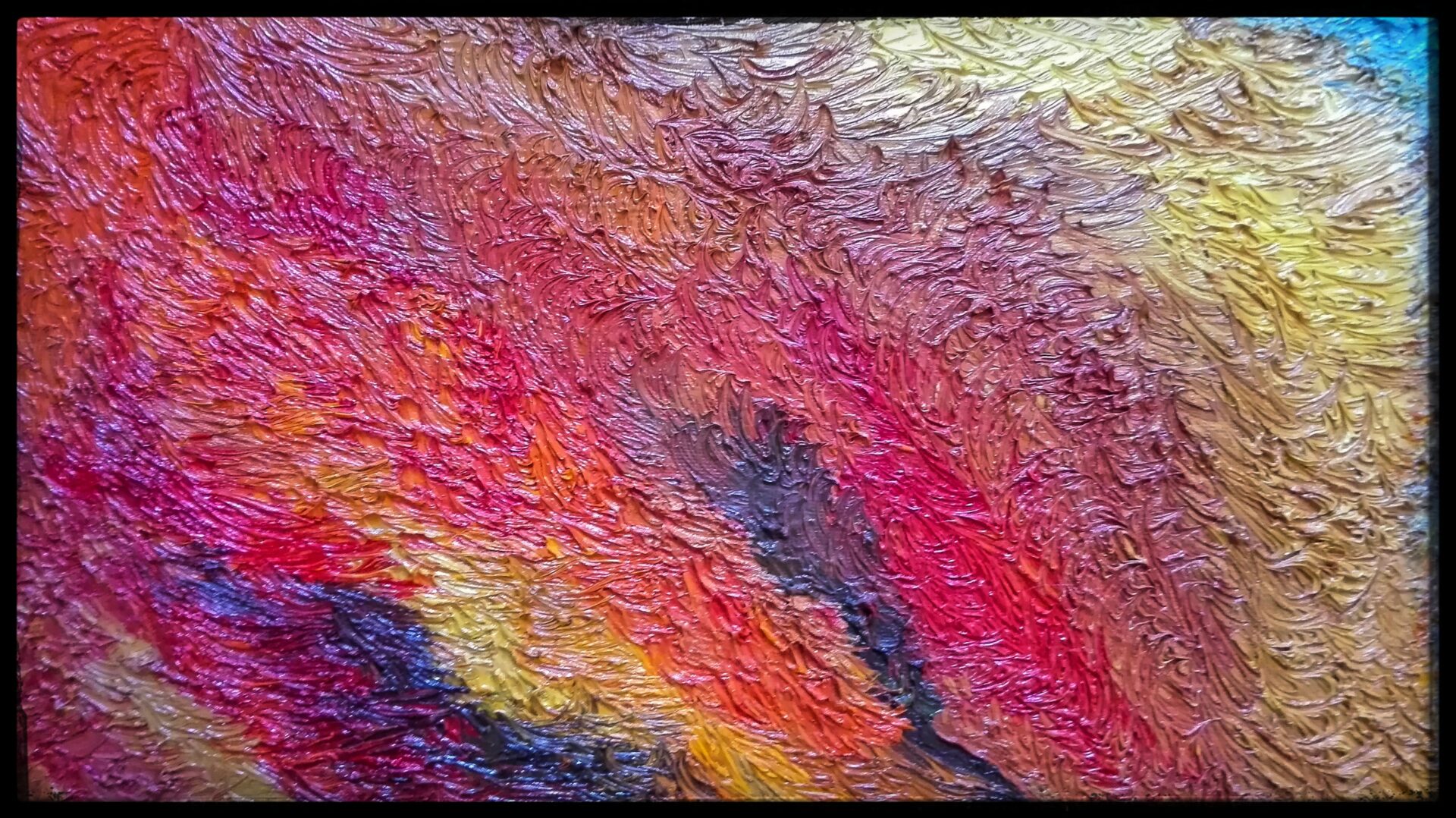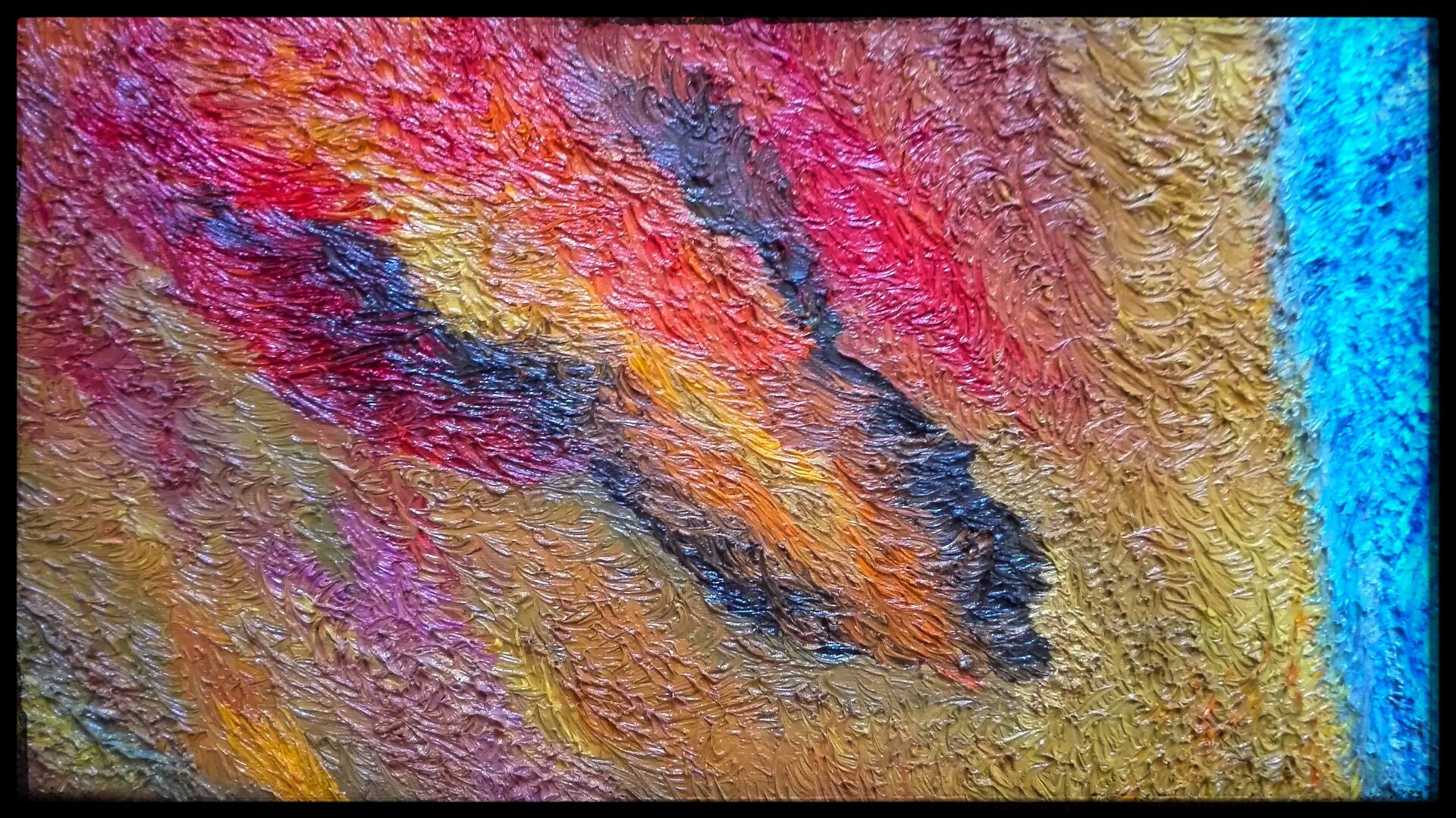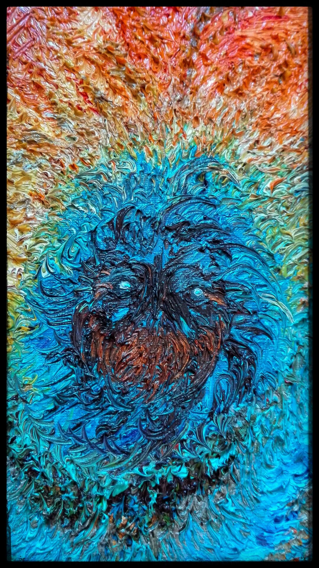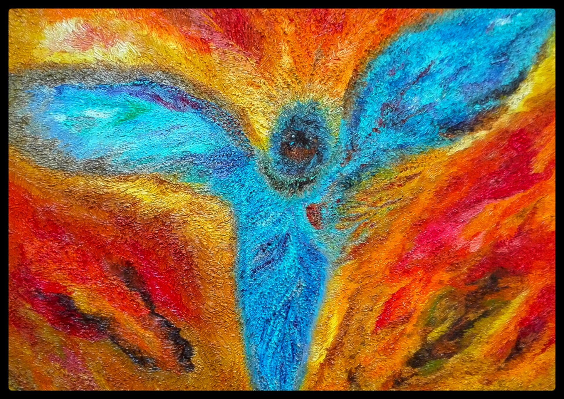Obraz namalowany niezwykle szczegółową i pracochłonną techniką olejną na płótnie, przedstawia anielską istotę wyłaniającą się z płomieni i popiołów niczym mityczny ptak Feniks, uznawany za symbol słońca i wiecznego odradzania się życia.