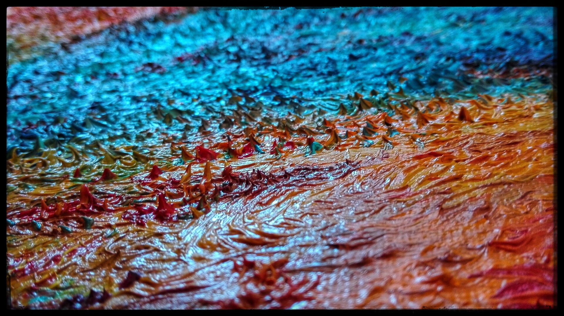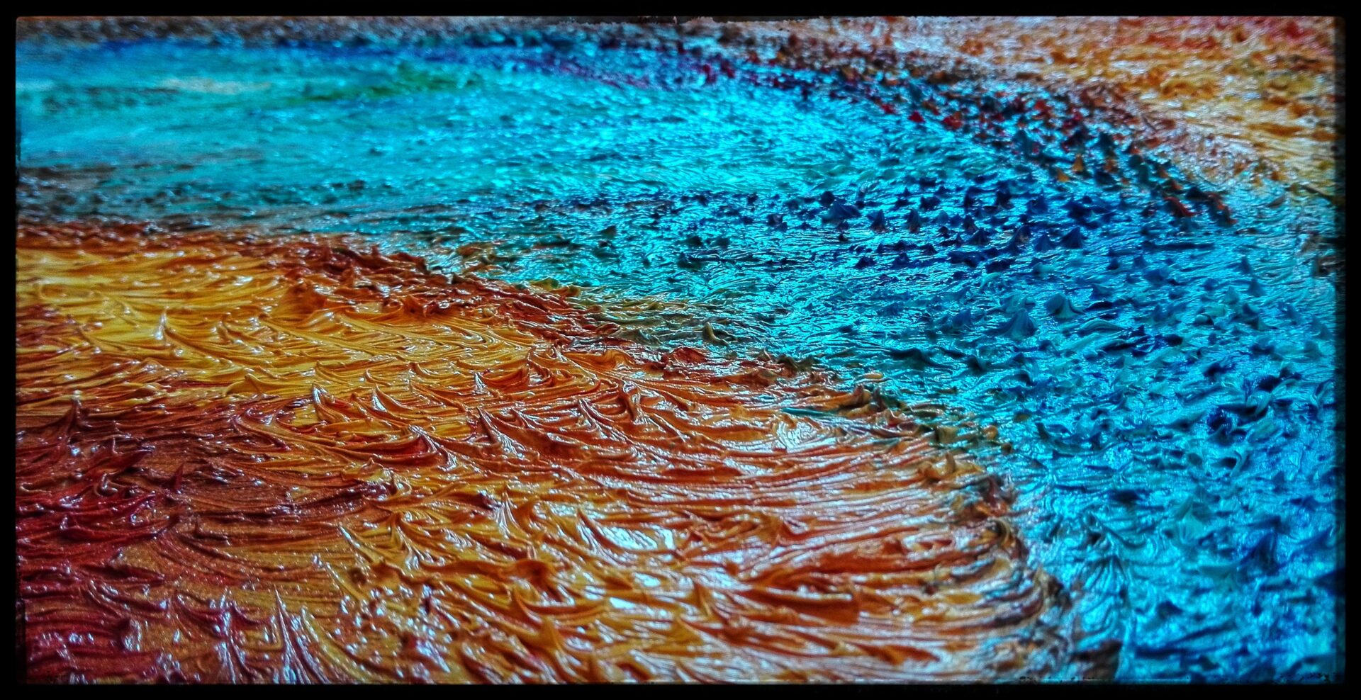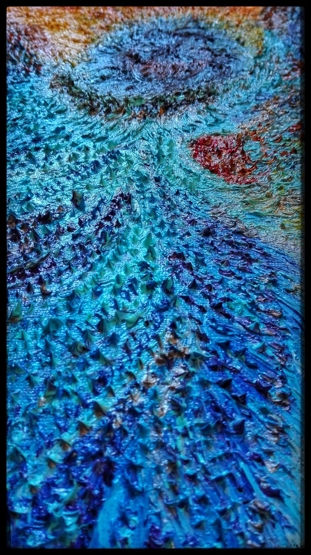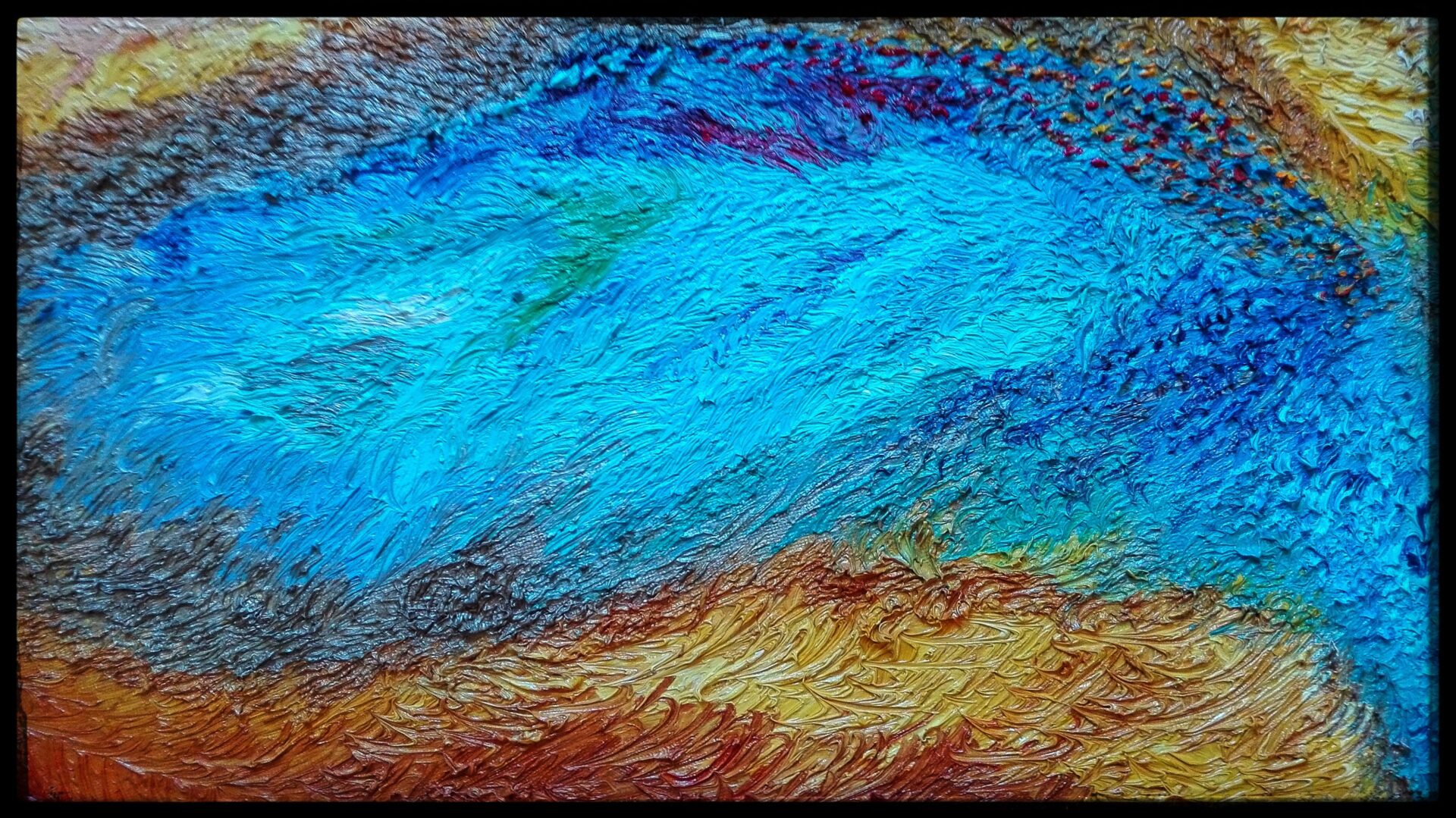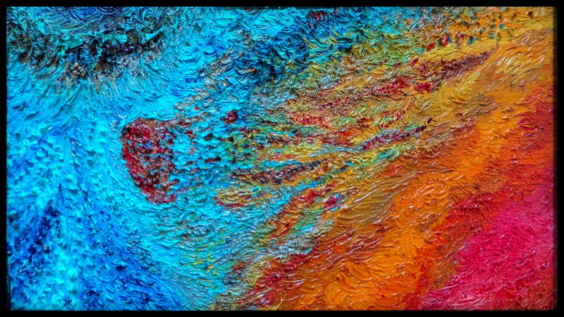 Obraz namalowany niezwykle szczegółową i pracochłonną techniką olejną na płótnie, przedstawia anielską istotę wyłaniającą się z płomieni i popiołów niczym mityczny ptak Feniks, uznawany za symbol słońca i wiecznego odradzania się życia.