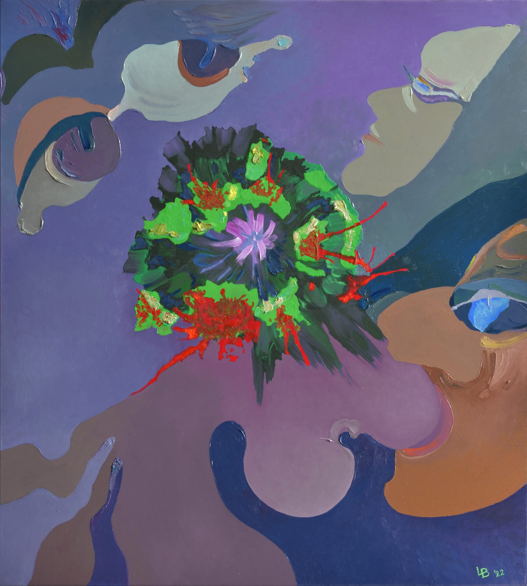 Marzenia i ludzkie emocje. Symbole piękna (np. forma bukietu) i zmysłowości (zarys piersi i profilu twarzy). Nad wszystkim tkwi forma przypominająca oko bacznego obserwatora a może stwórcy…