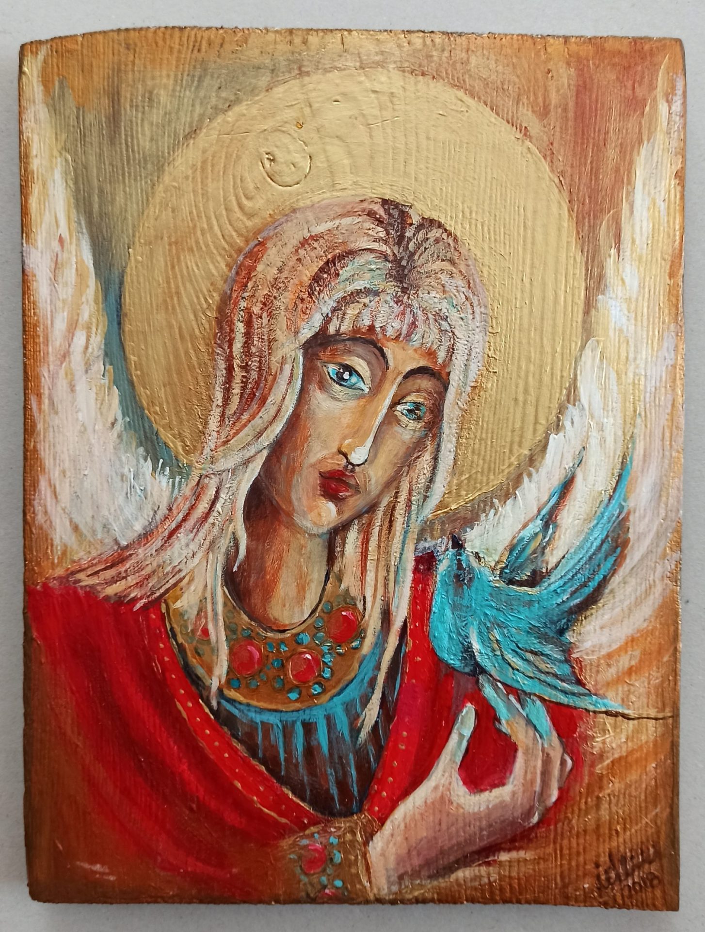 IKONA AUTORSKA. MALOWANA FARBĄ AKRYLOWĄ NA DESCE SOSNOWEJ. KOLORYSTYKA NASYCONA, KONTRAKTOWI. PRACA POKRYTA KILKOMA WARSTWAMI SZELAKU.