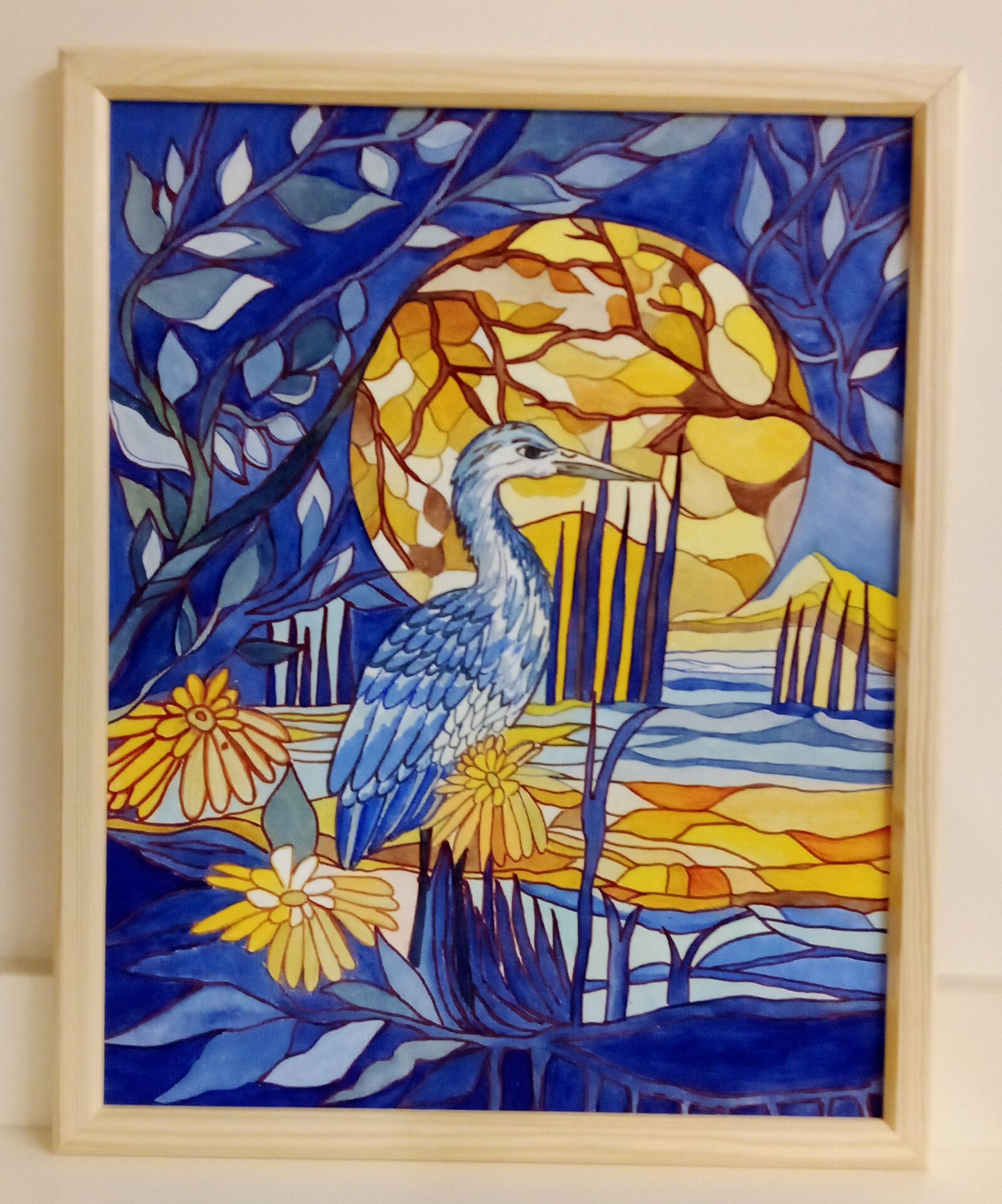 Obraz wykonany farbami akrylowymi na płycie malarskiej. Oprawiony w drewnianą, naturalną ramę.