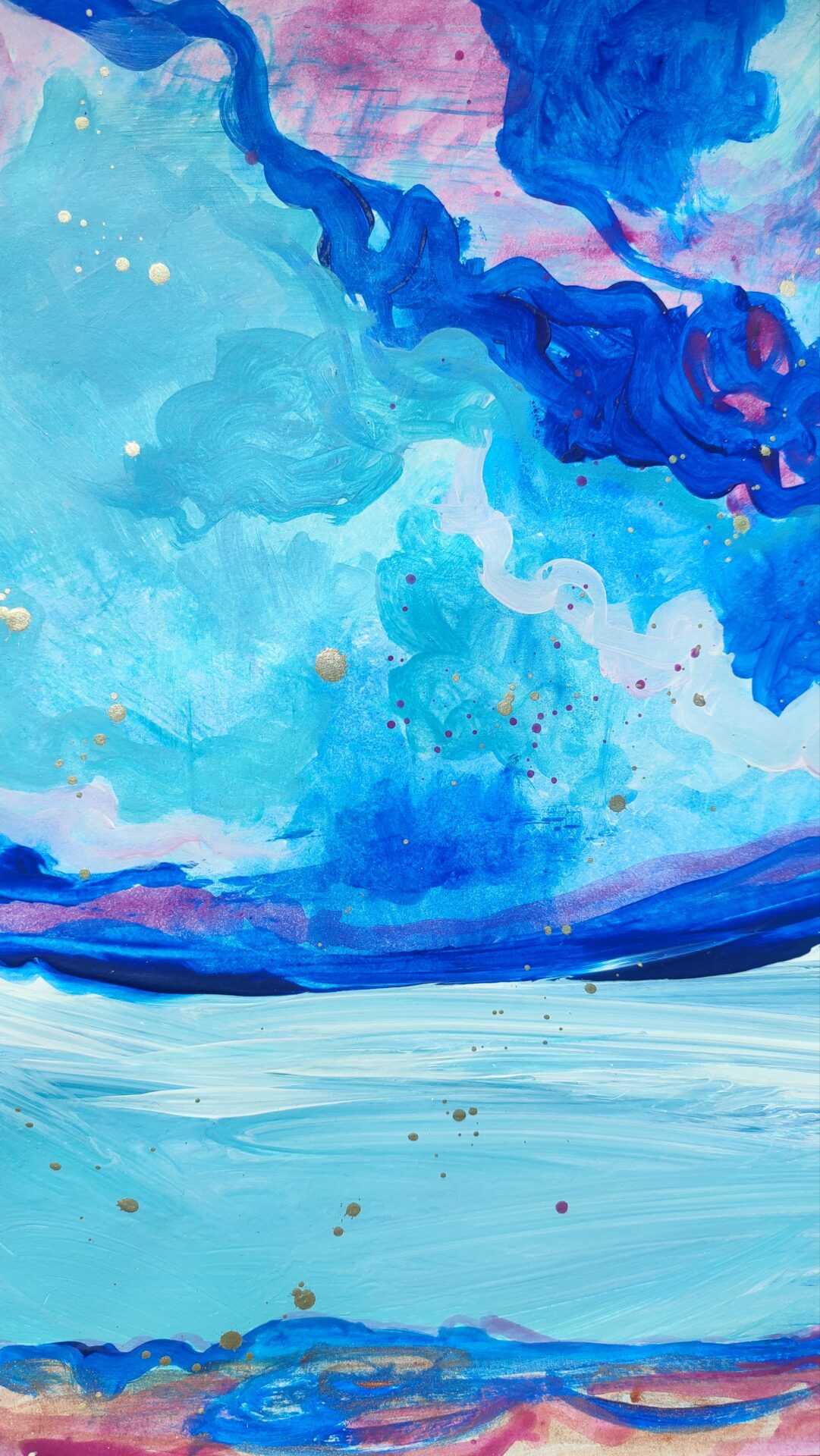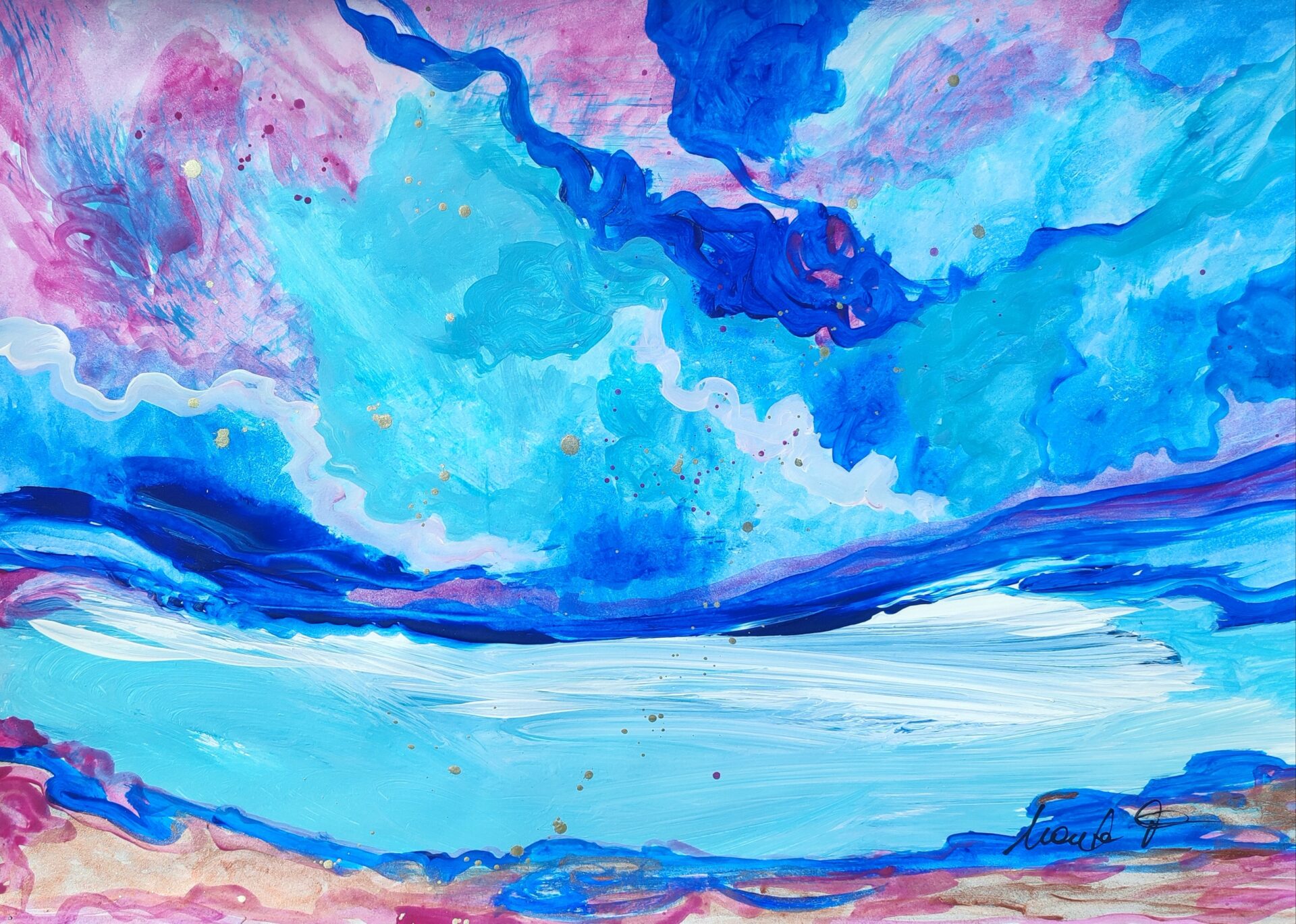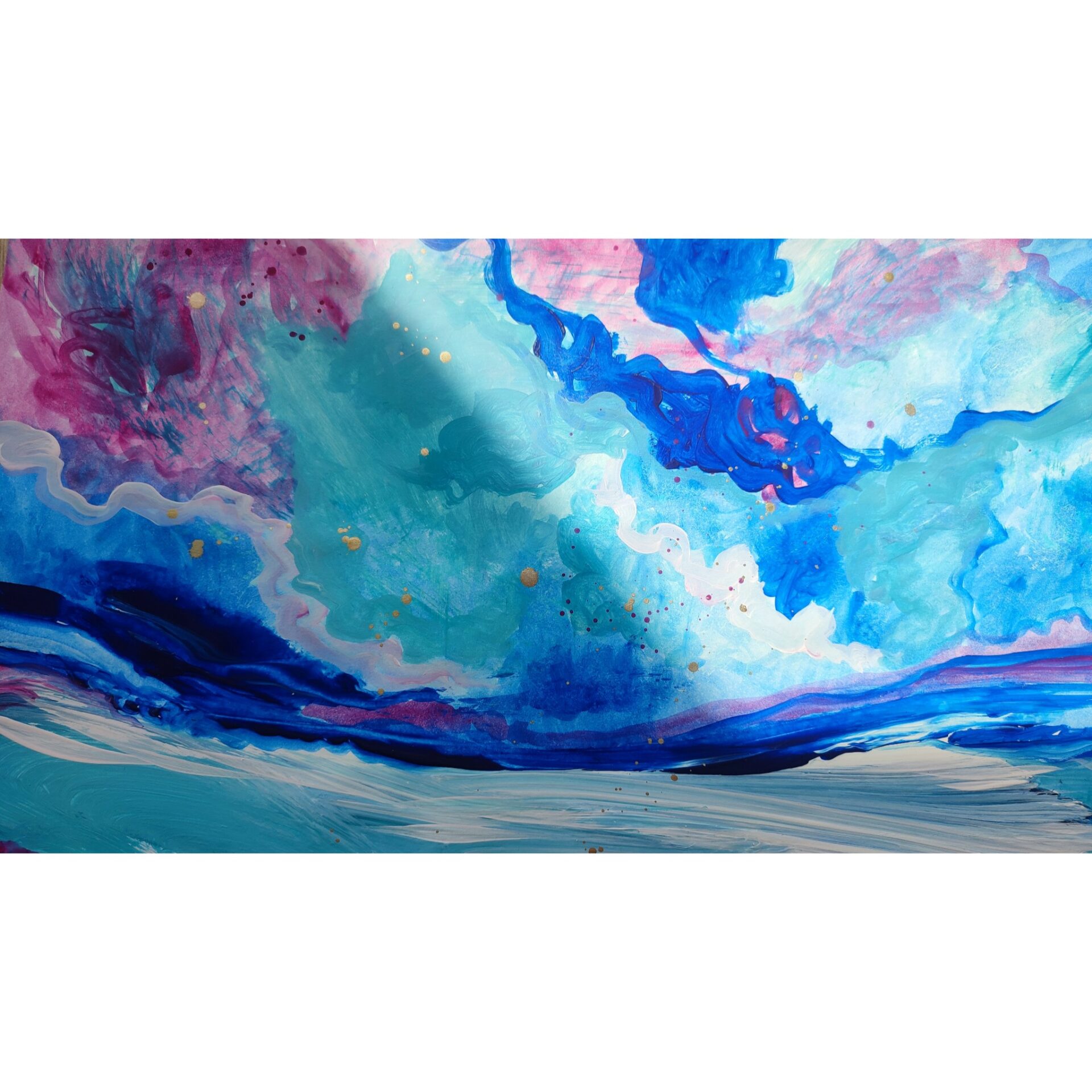 Obraz akrylowy wykonany na papierze o wysokiej jakości w intensywnych kolorach z odrobiną złota. Obraz idealnie wygląda w białej ramie. Sygnowany z przodu oraz z tyłu obrazu.