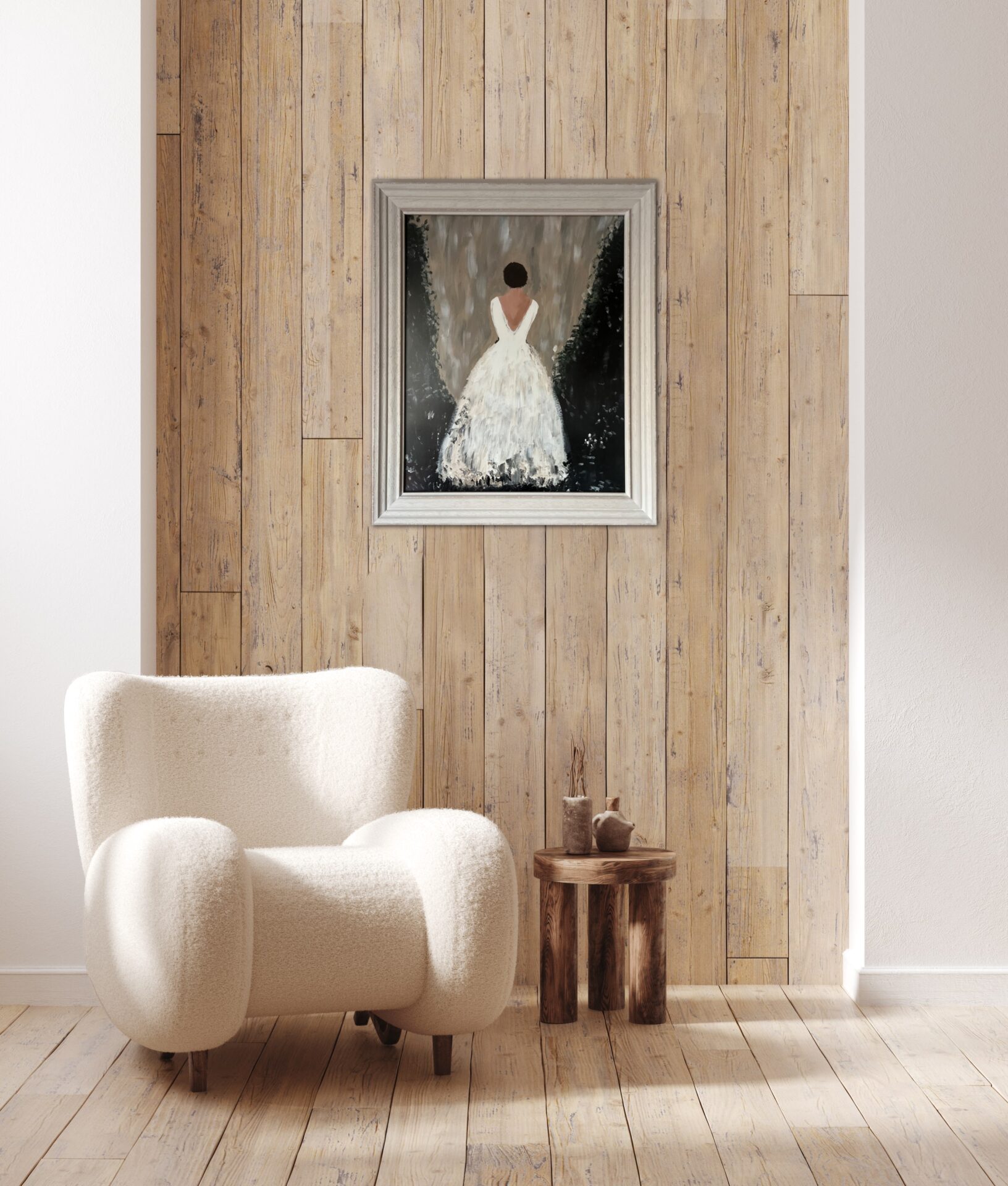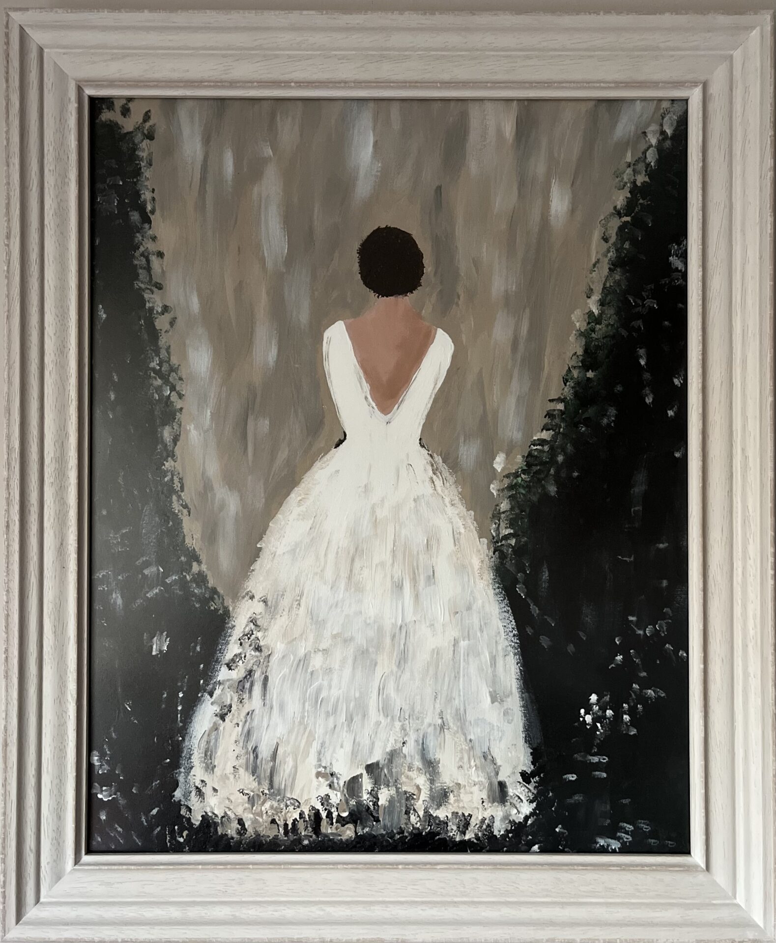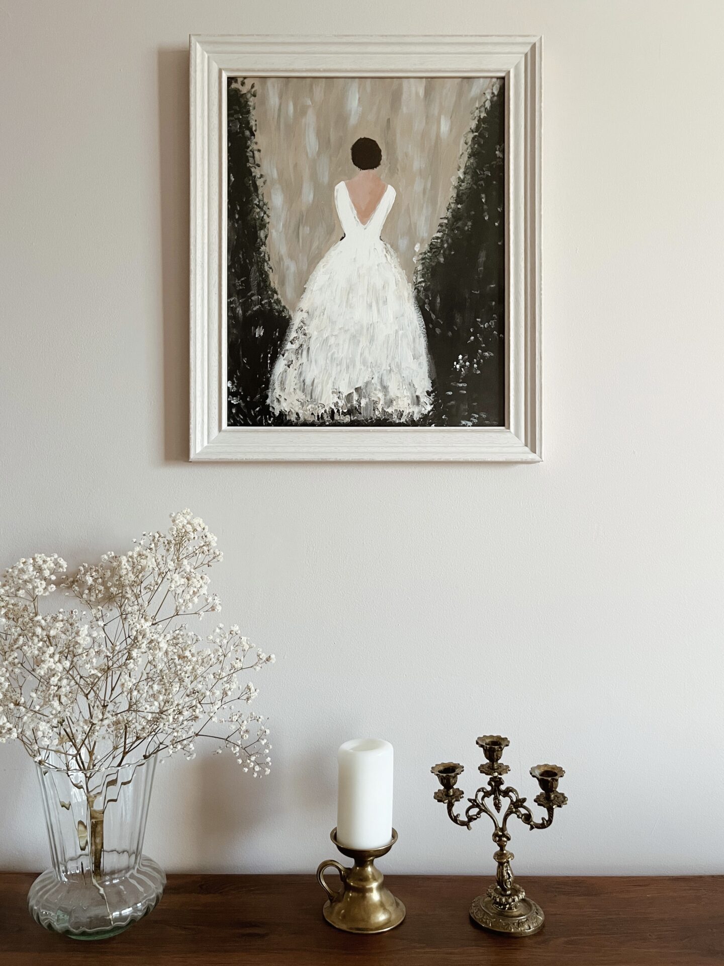 Obraz jest oprawiony w drewnianą, białą ramę o delikatnym efekcie postarzenia.