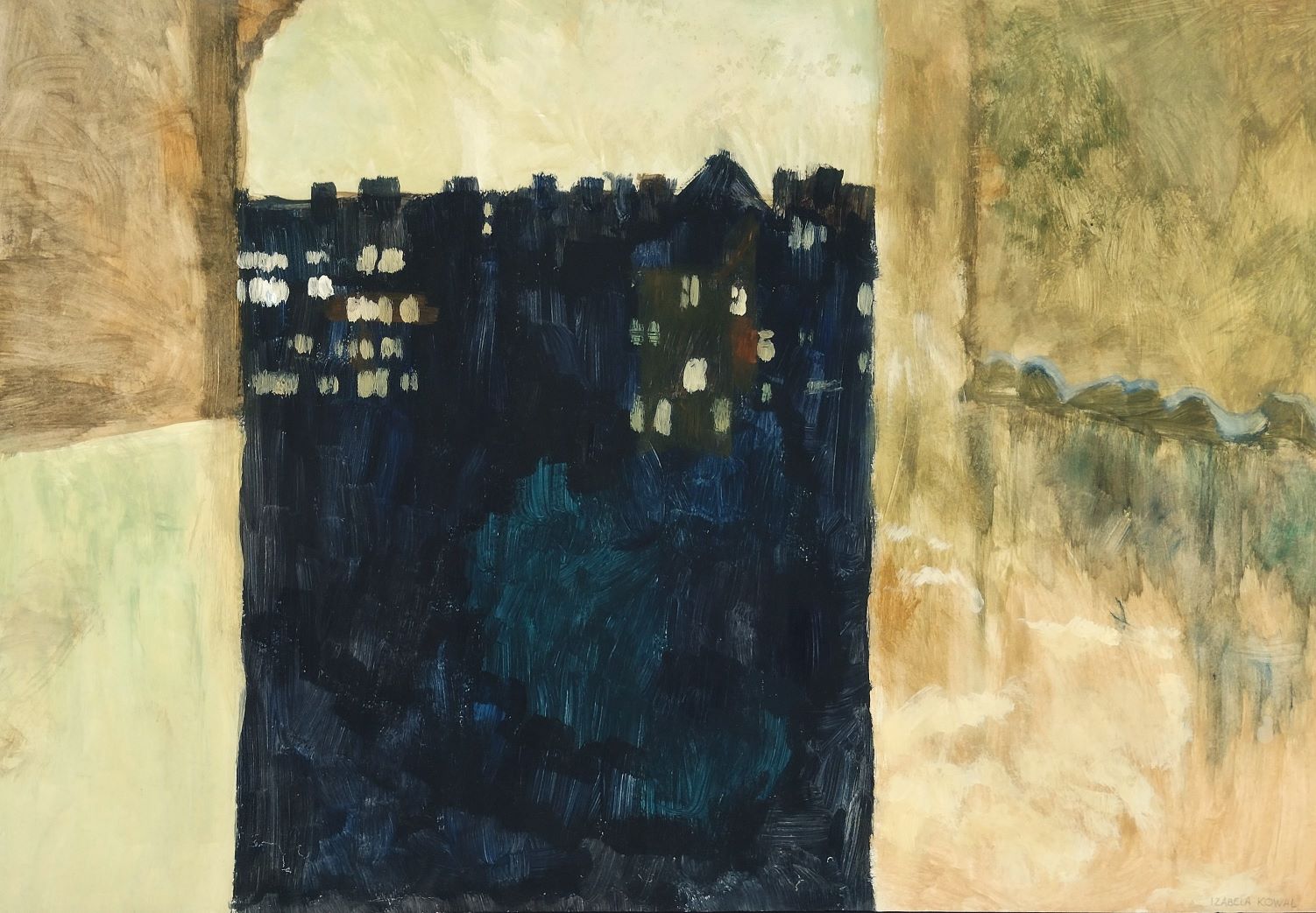 Widok miasta nocą, które nigdy nie śpi, wykonany w technice tempery, wymiary: 50/70 cm, oprawa – antyrama z pleksi