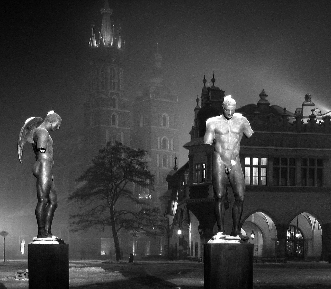 Gdy fotografowałem nocą te dwie rzeźby Igor Mitoraja ująłem je w kadrze tak, aby uzyskać sugestię, że rozmawiają ze sobą. Krakowski smog, który w zimie dusi miasto, na fotografii dał trzy osobne plany, rzeźby na pierwszym, Sukiennice – jeszcze ze szczegółami – na drugim i na trzecim kościół Mariacki przesłonięty zawiesiną mgły. Fotografia ma wymiary 30 × 26 cm ( 32 × 28 z passe-partout). Limit wydruków: 1/10.