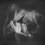 Na tym obrazie dominuje kontrast czerni i bieli, które tworzą pełen napięcia dialog między światłem a cieniem. Postać ludzka, skulona w pozycji embrionalnej, zdaje się być otoczona ciemnością, a jednocześnie subtelnie oświetlona, co podkreśla dramatyzm sceny. Kształt dłoni i ramion wyraźnie zarysowuje się na tle głębokiej czerni, tworząc niemal namacalną teksturę. Kompozycja skupia się na detalu ciała, podkreślając jego kruche piękno. Atmosfera obrazu jest intymna i nieco melancholijna, jakby artysta chciał uchwycić chwilę głębokiej refleksji lub bólu.