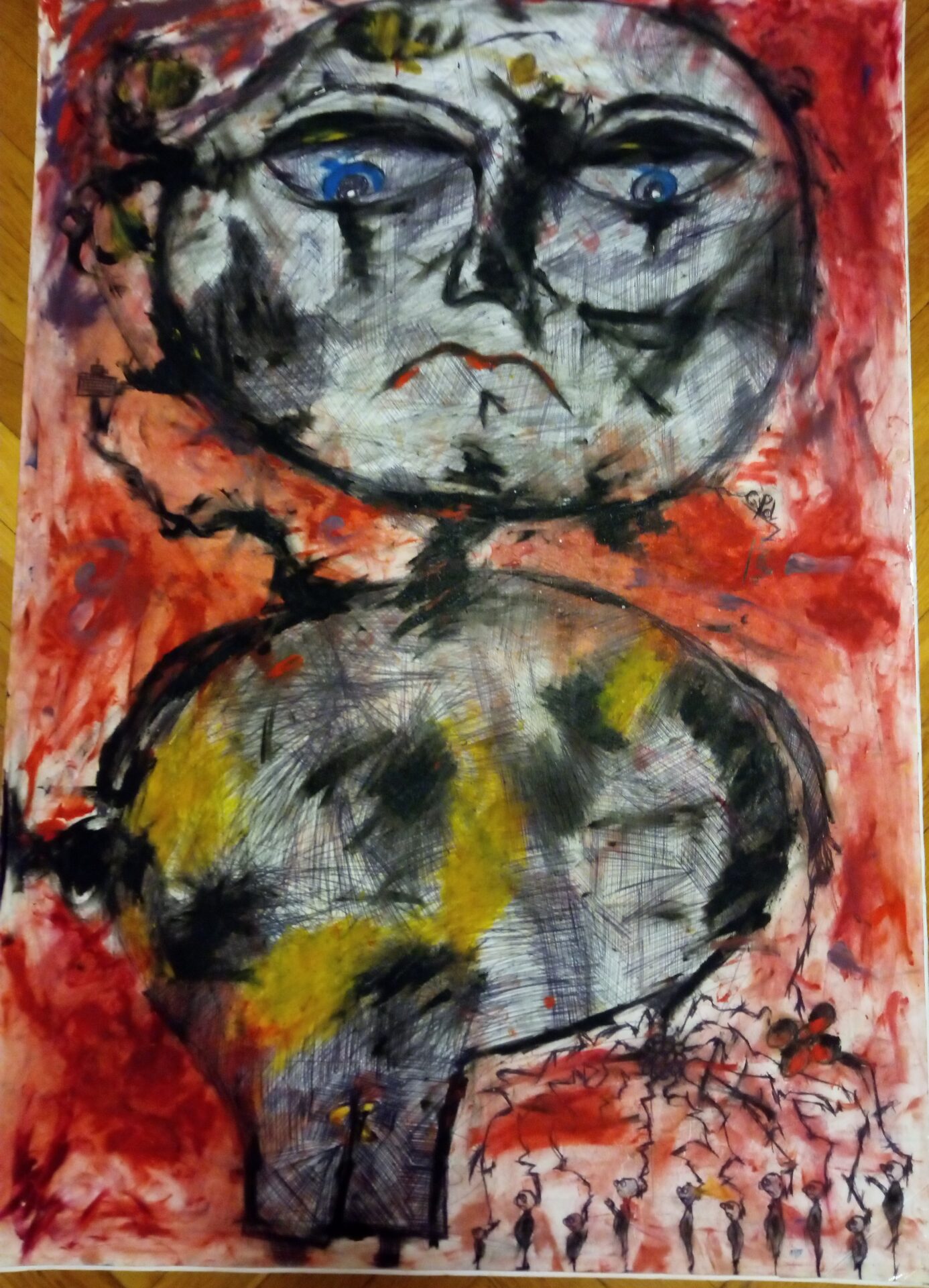 Rysunek przedstawia smutnego stworka pojawiającego się w moich snach. Dzieło wykonane jest na brystolu długopisami i farbami olejnymi. Rysunek podklejony jest drugim brystolem dla usztywnienia pracy. Polecam i pozdrawiam miłośników sztuki