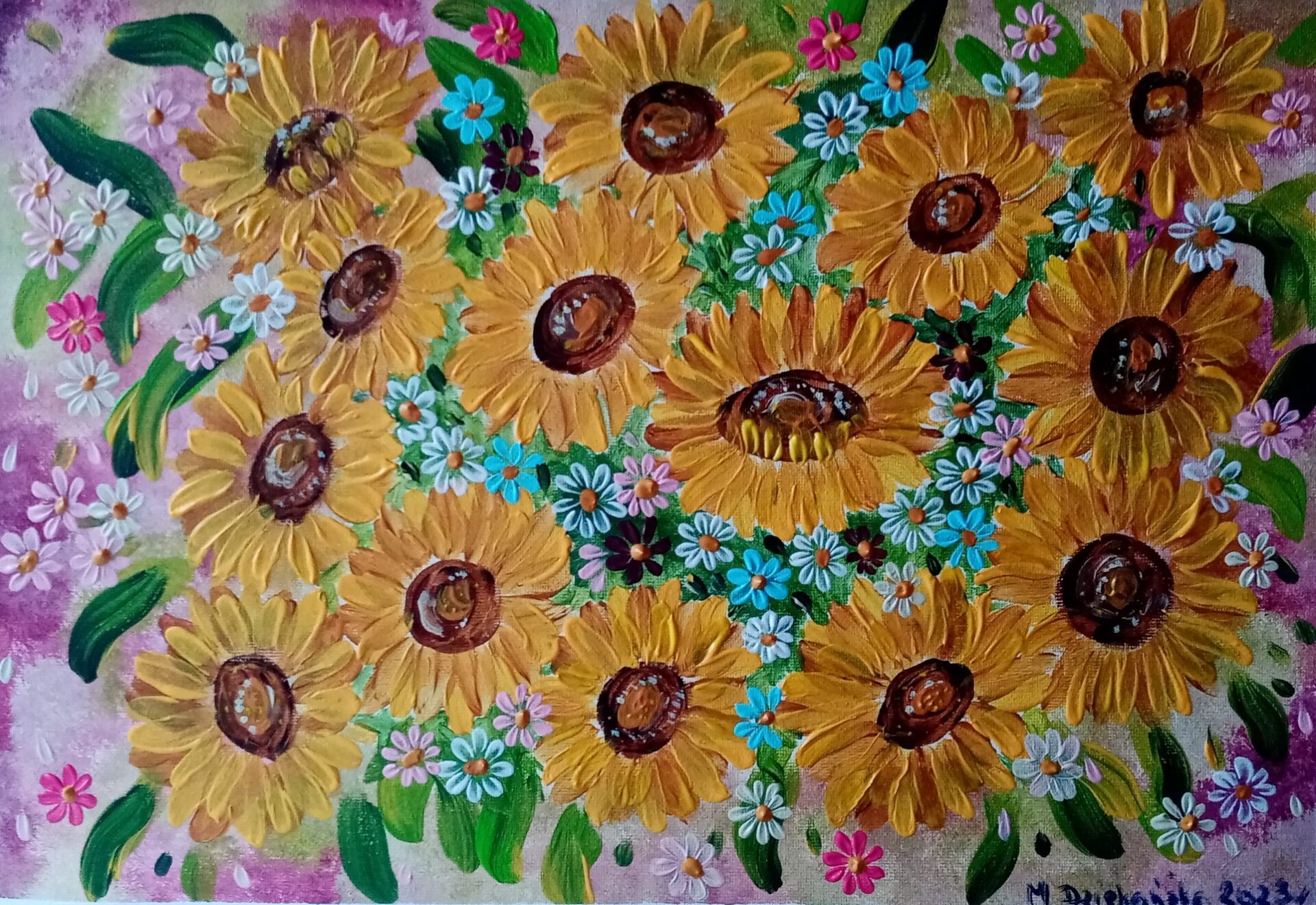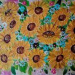 Słoneczniki, format A 3 , gruba warstwa farby widoczna na zdjęciach.