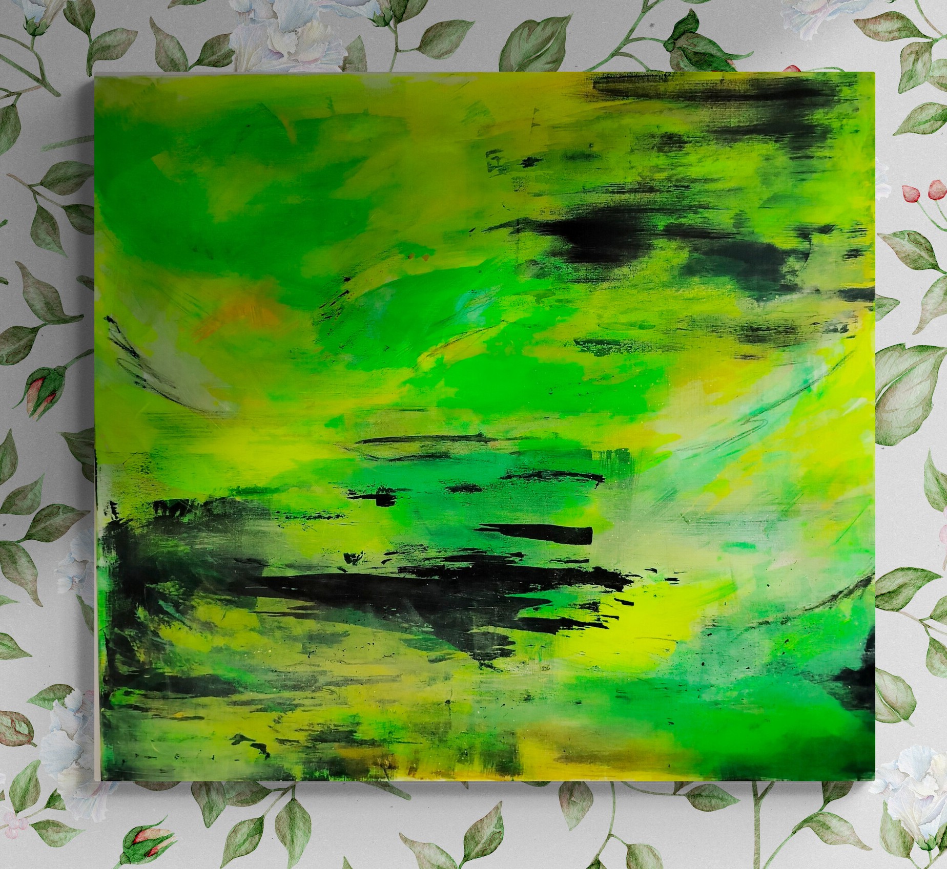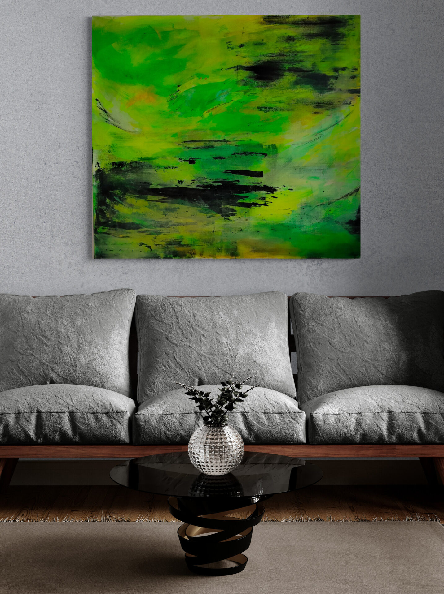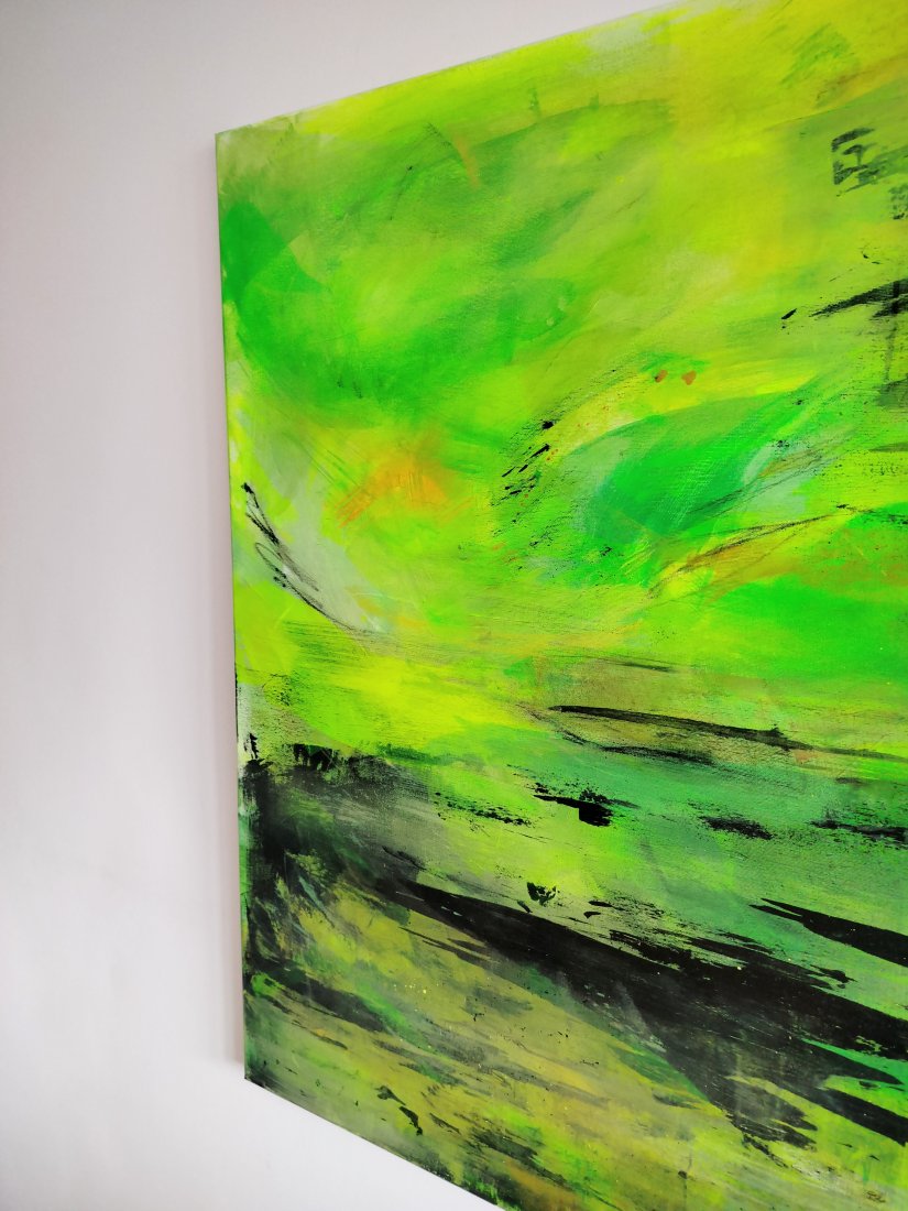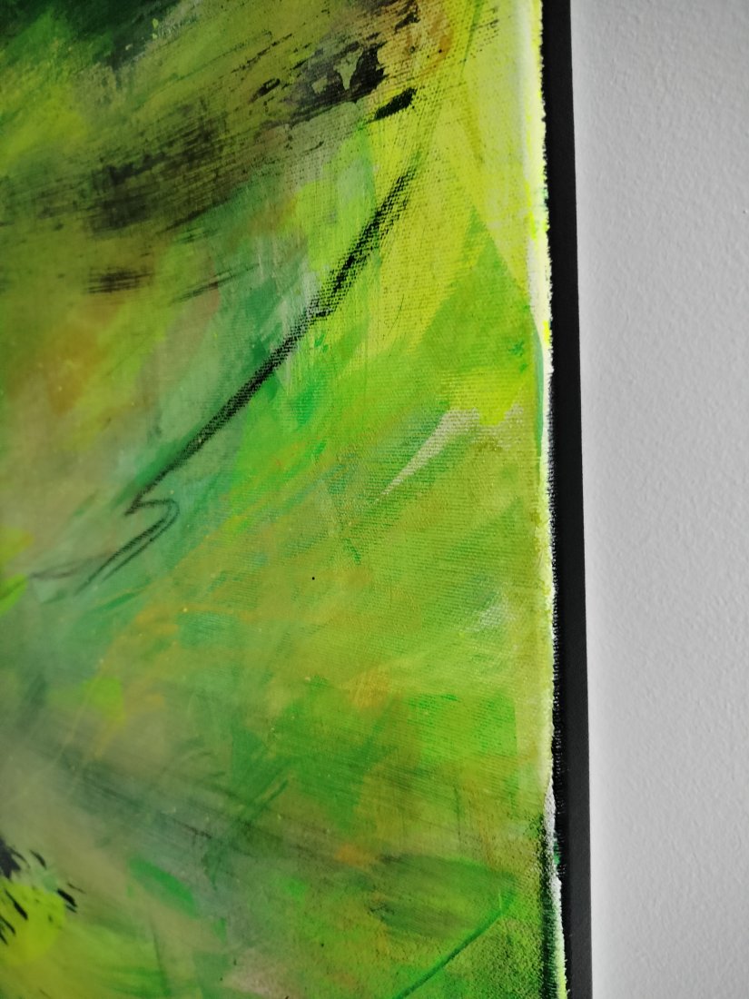 Przeważające barwy obrazu: zielony, żółty, czarny z odrobiną pomarańczowego. Użyto także farb fluorescencyjnych, dzięki czemu obraz ożywi wnętrze. Czarne boki podkreślają te kolory.