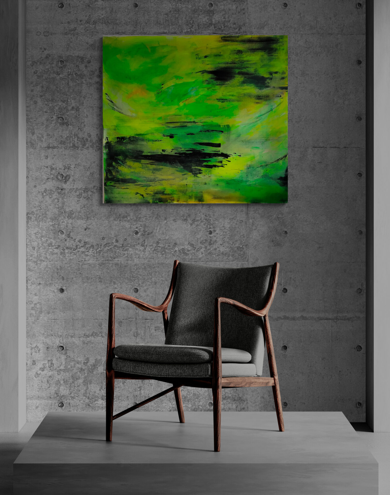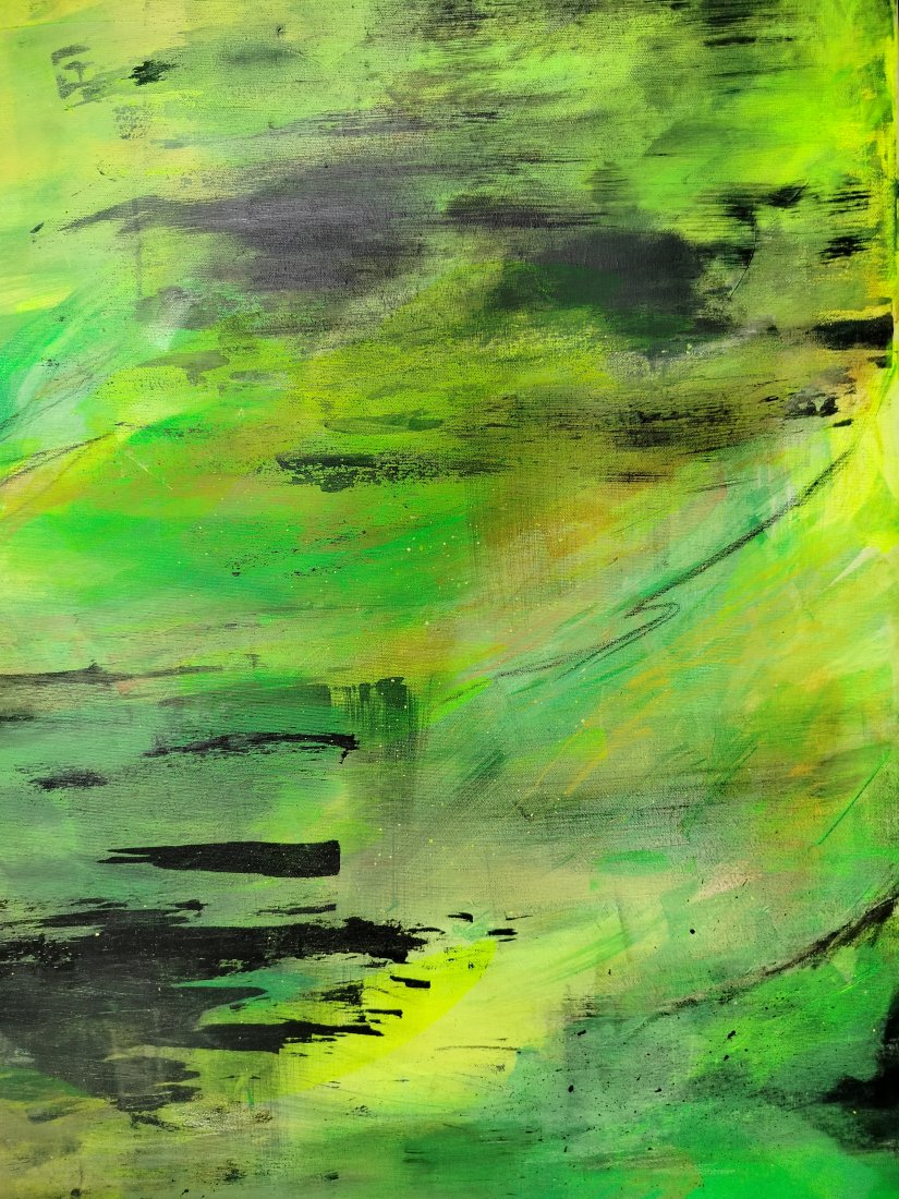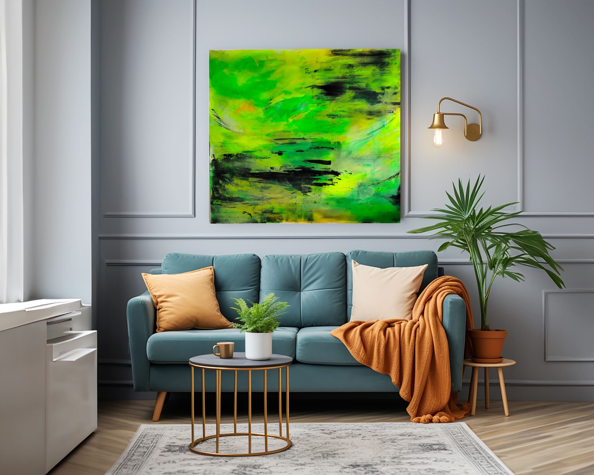 Przeważające barwy obrazu: zielony, żółty, czarny z odrobiną pomarańczowego. Użyto także farb fluorescencyjnych, dzięki czemu obraz ożywi wnętrze. Czarne boki podkreślają te kolory.