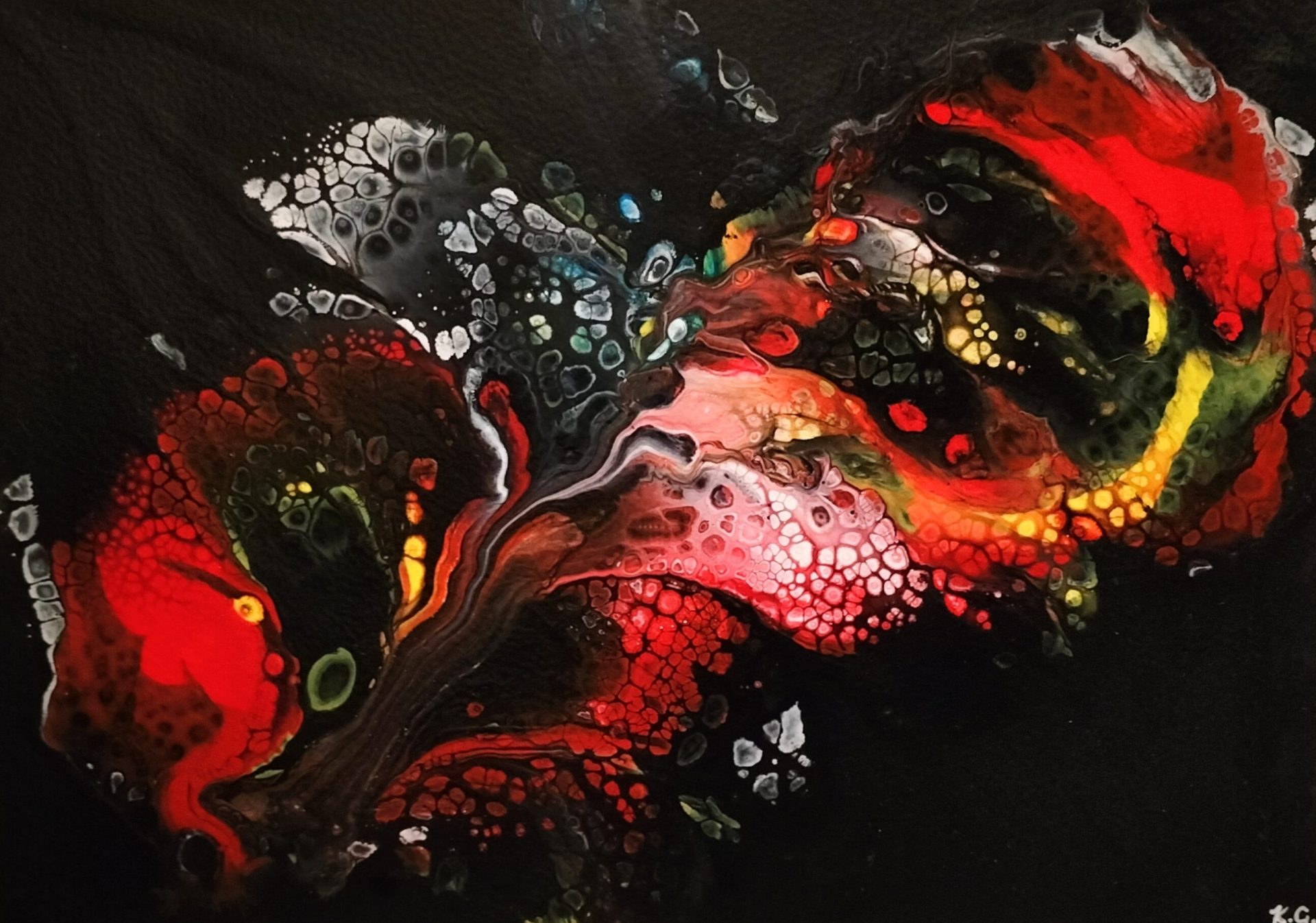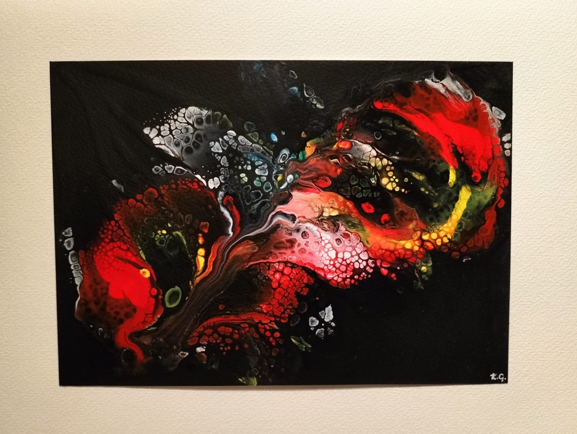Obraz wykonany farbami akrylowymi na specjalnym papierze przeznaczonym do farb wodnych o gramaturze 300gsm. Namalowany nowatorska metoda, opracowaną przeze mnie, poprzedzona wieloma próbami.