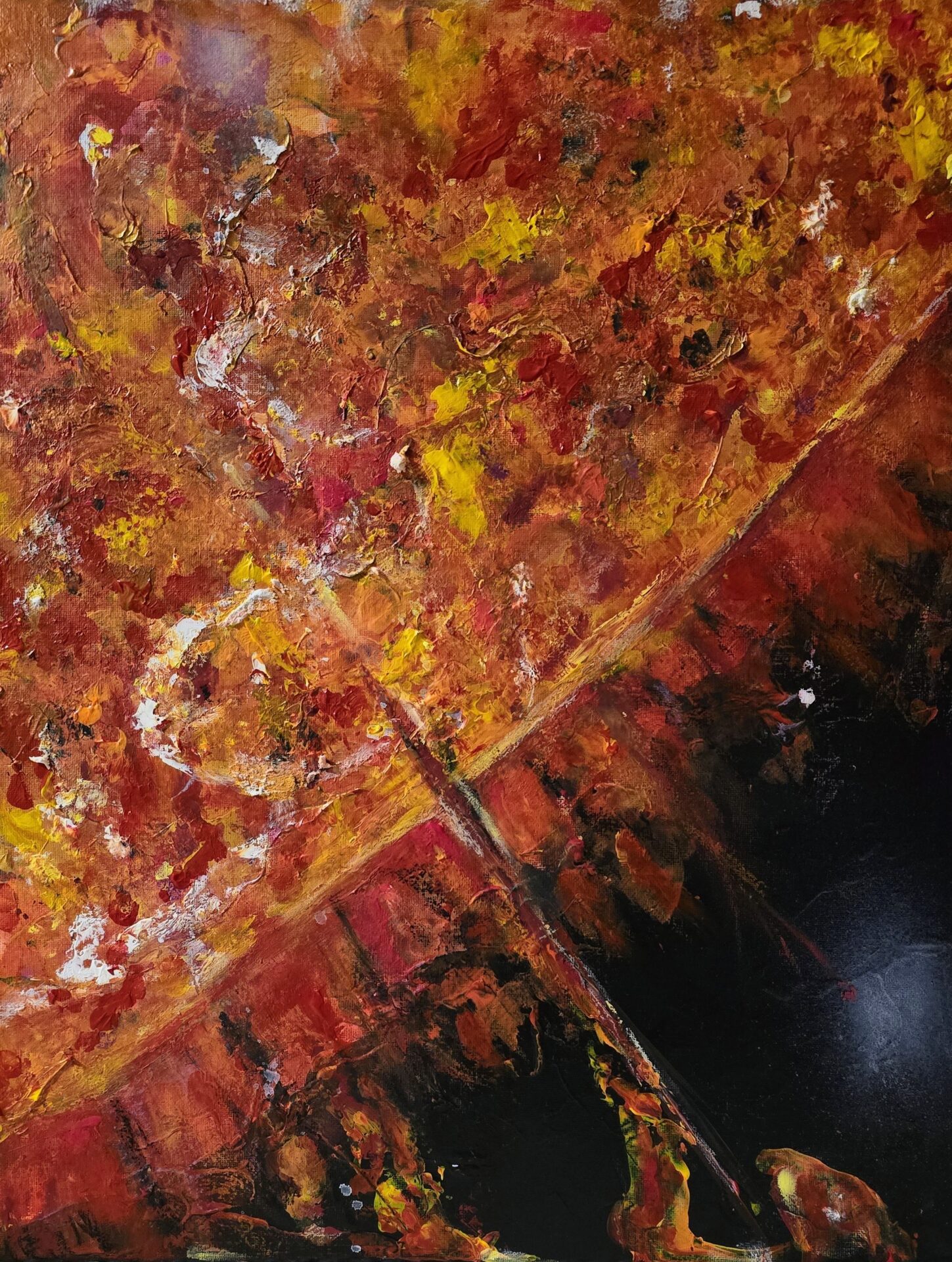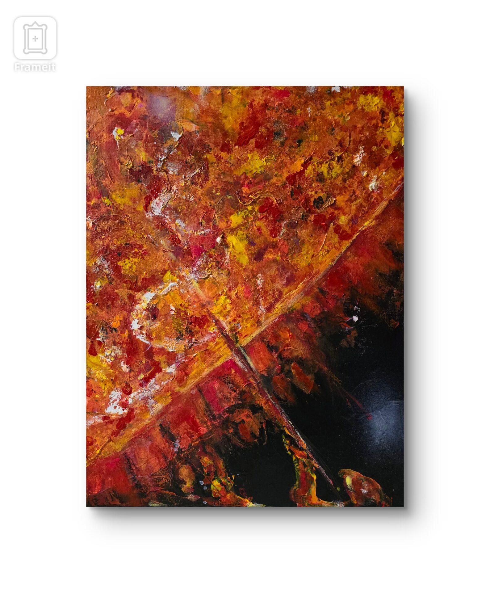Obraz jest prawdziwą eksplozją kolorów. Dominują tu odcienie ciepłych barw: głównie czerwienie, oranże i żółcie, które przepływają przez płótno niczym jesienny pejzaż. Kompozycja jest dynamiczna, pełna ruchu, z jasnymi plamami wybuchającymi na tle ciemniejszych tonów. Artysta z pewnością postawił na abstrakcyjny styl, używając techniki impasto. Dzięki temu farba jest grubo nałożona, a tekstura niemal wypływa z obrazu.