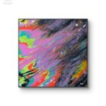 Obraz przedstwia intrygującą mozaikę kolorów, które wyglądają jakby żyły własnym życiem. Dominują intensywne fiolety, zielenie i pomarańcze, które dynamicznie mieszają się i przenikają. Te barwy tworzą chaotyczną, ale zarazem hipnotyzującą kompozycję pełną energii i ruchu. Czarne smugi i białe plamki dodają głębii, jakby całość była fragmentem nieskończonego kosmosu. To co widać, wydaje się być spontaniczne, trochę jak zabawa z farbami, ale z jakimś nienazwanym porządkiem w tle.