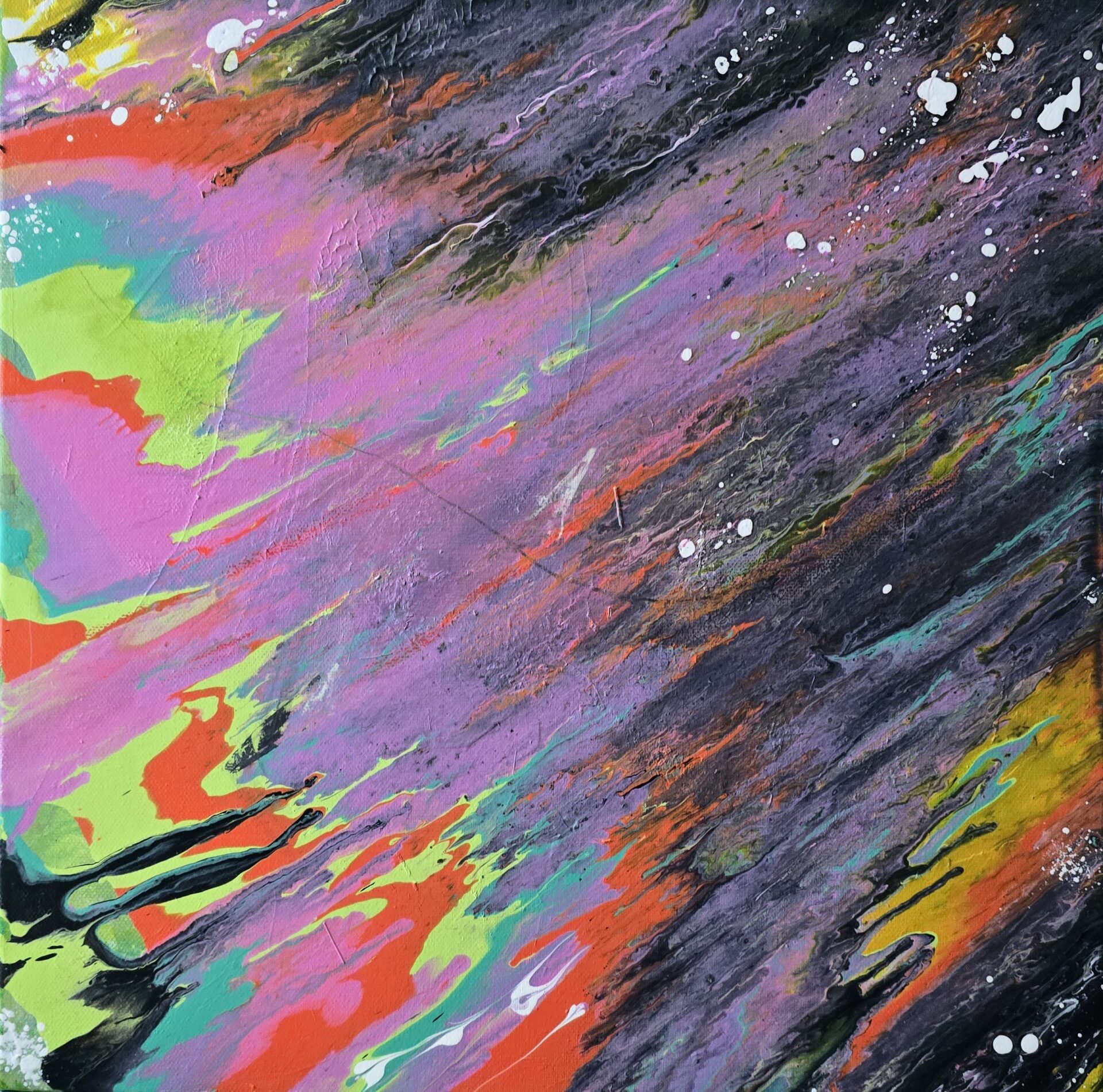 Obraz przedstwia intrygującą mozaikę kolorów, które wyglądają jakby żyły własnym życiem. Dominują intensywne fiolety, zielenie i pomarańcze, które dynamicznie mieszają się i przenikają. Te barwy tworzą chaotyczną, ale zarazem hipnotyzującą kompozycję pełną energii i ruchu. Czarne smugi i białe plamki dodają głębii, jakby całość była fragmentem nieskończonego kosmosu. To co widać, wydaje się być spontaniczne, trochę jak zabawa z farbami, ale z jakimś nienazwanym porządkiem w tle.