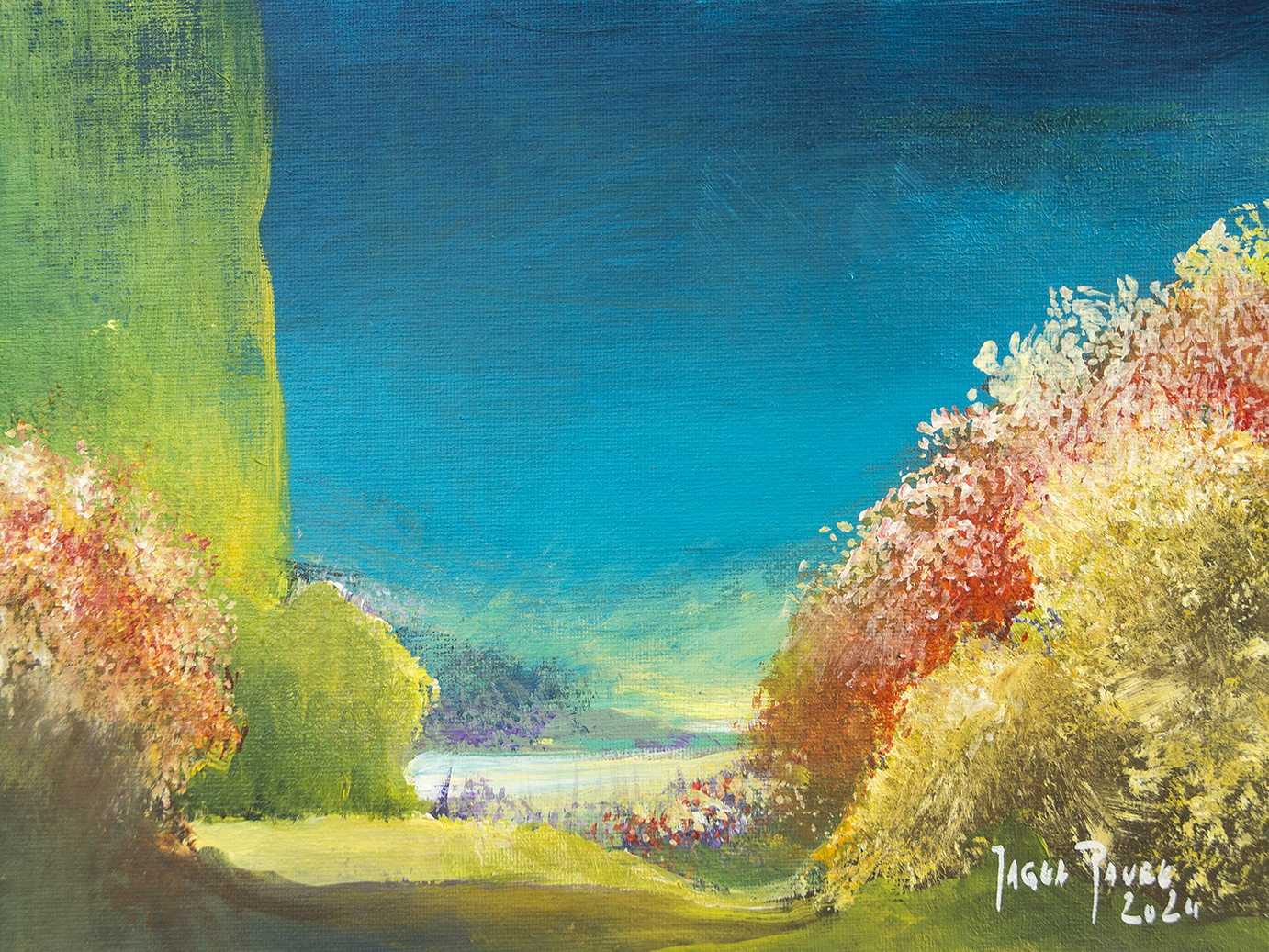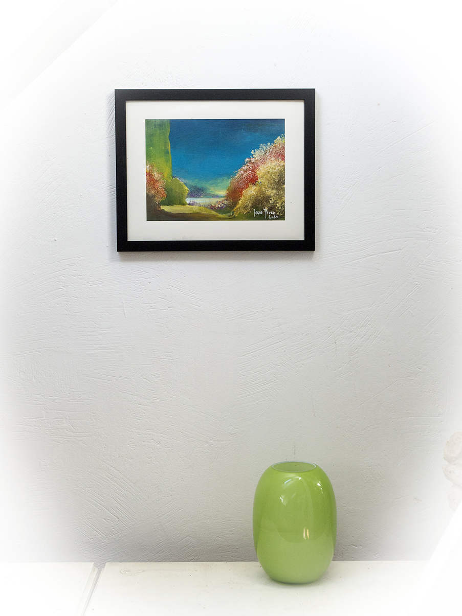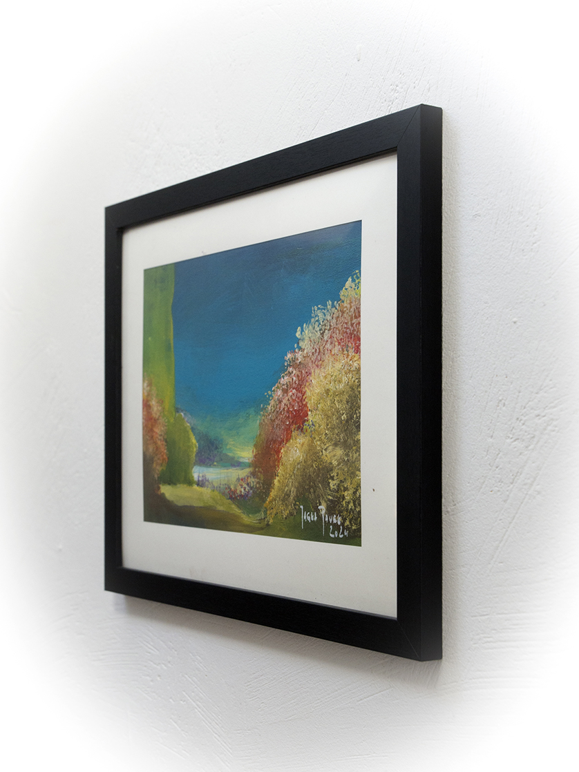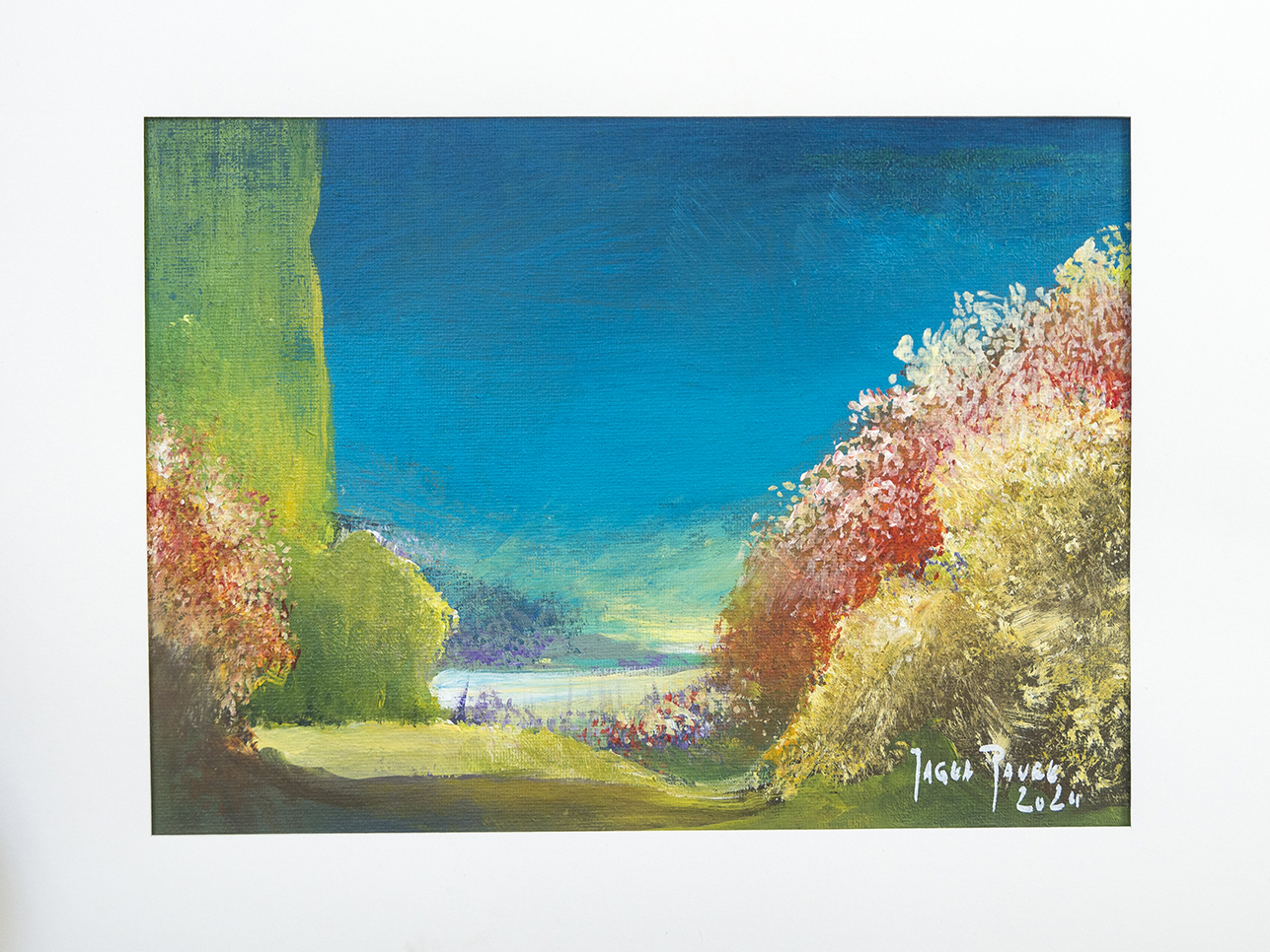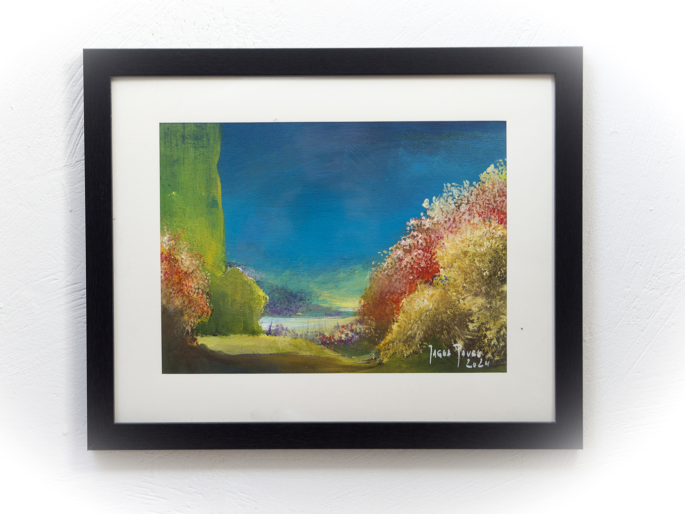 Praca autorska AFRP P.Jagła na płótnie z arkusza A4 granulacja 280g farby akrylowe Maxi Acril „Renesans”, „Amsterdam” „Winsor & Newton” .Praca oprawiona w ramce wymiar: 36,5×29,5 cm Praca sygnowana przez autora z przodu i tyłu.