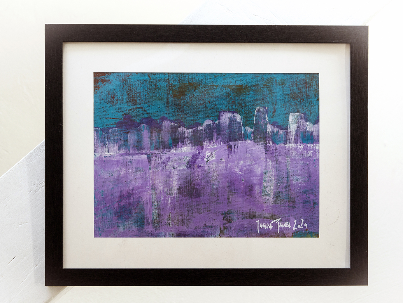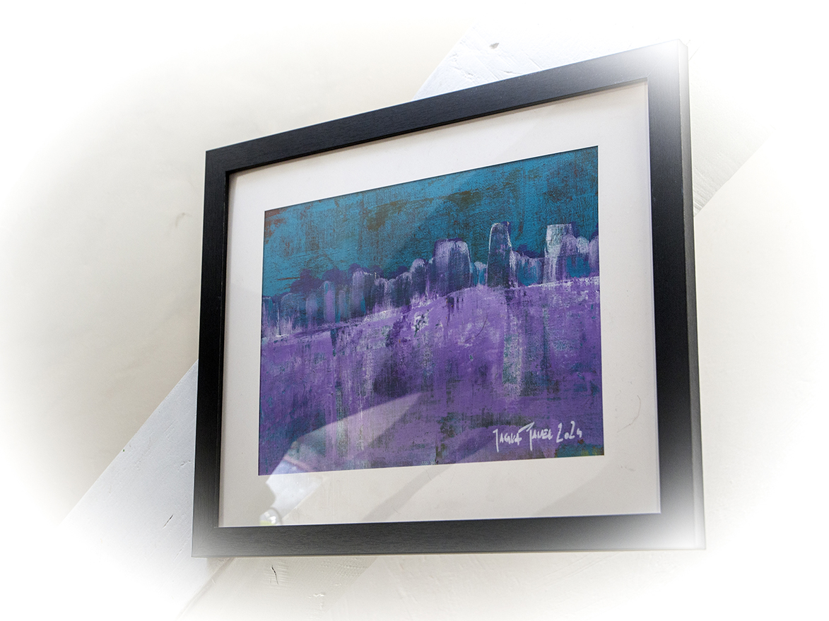 Praca autorska AFRP P.Jagła na płótnie z arkusza A4 granulacja 280g farby akrylowe Maxi Acril „Renesans”, „Amsterdam” „Winsor & Newton” .Praca oprawiona w ramce wymiar: 36,5×29,5 cm Praca sygnowana przez autora z przodu i tyłu.