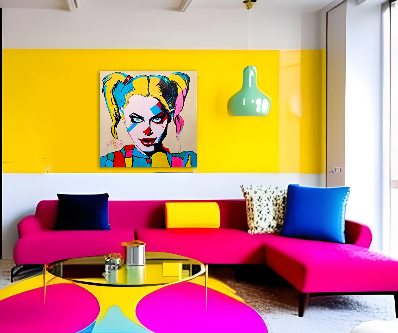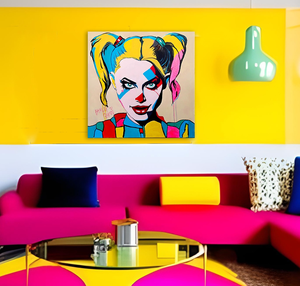 Obraz inspirowany superbohaterką komiksów DC Harley Quinn. Praca w energetycznych, kontrastujących kolorach. Obraz ożywi każde pomieszczenie – sypialnię , salon, pokój nastolatka. Idealnie sprawdzi się jako prezent dla fanów filmów oraz komiksów.
