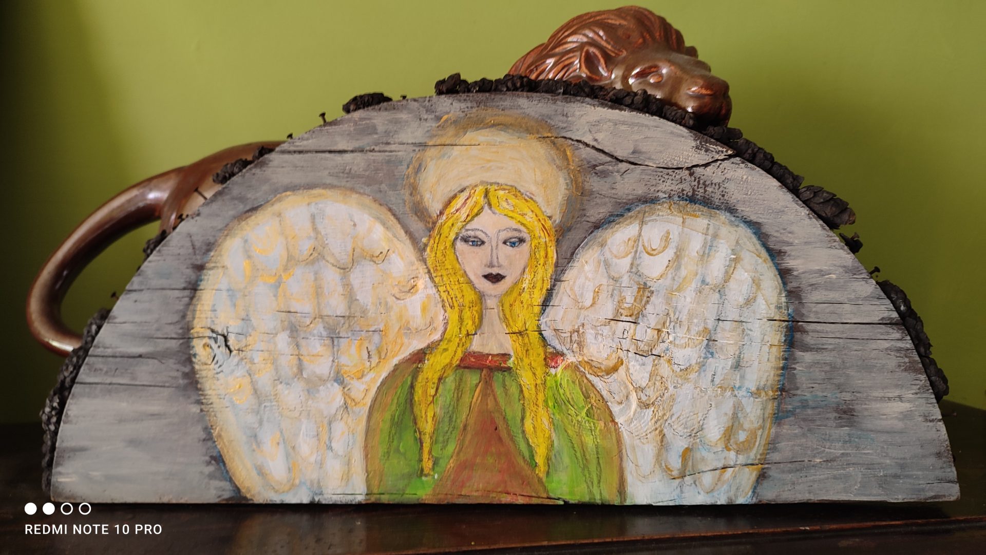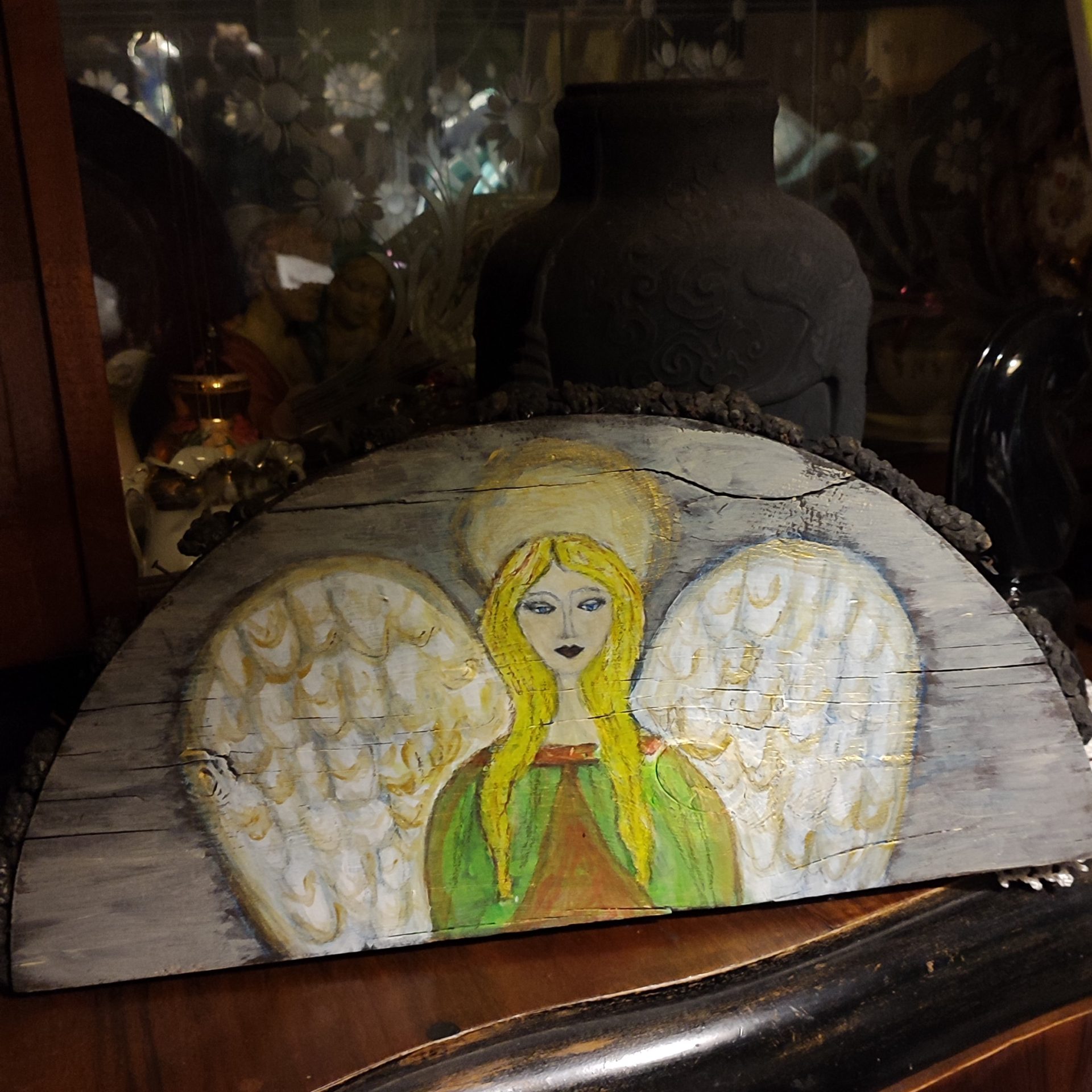 Obraz anioł na starej desce ręcznie malowany, wym 20x40cm technika akryl i zloocenia piękna ozdoba do wnętrza w sielankowo wiejskim stylu